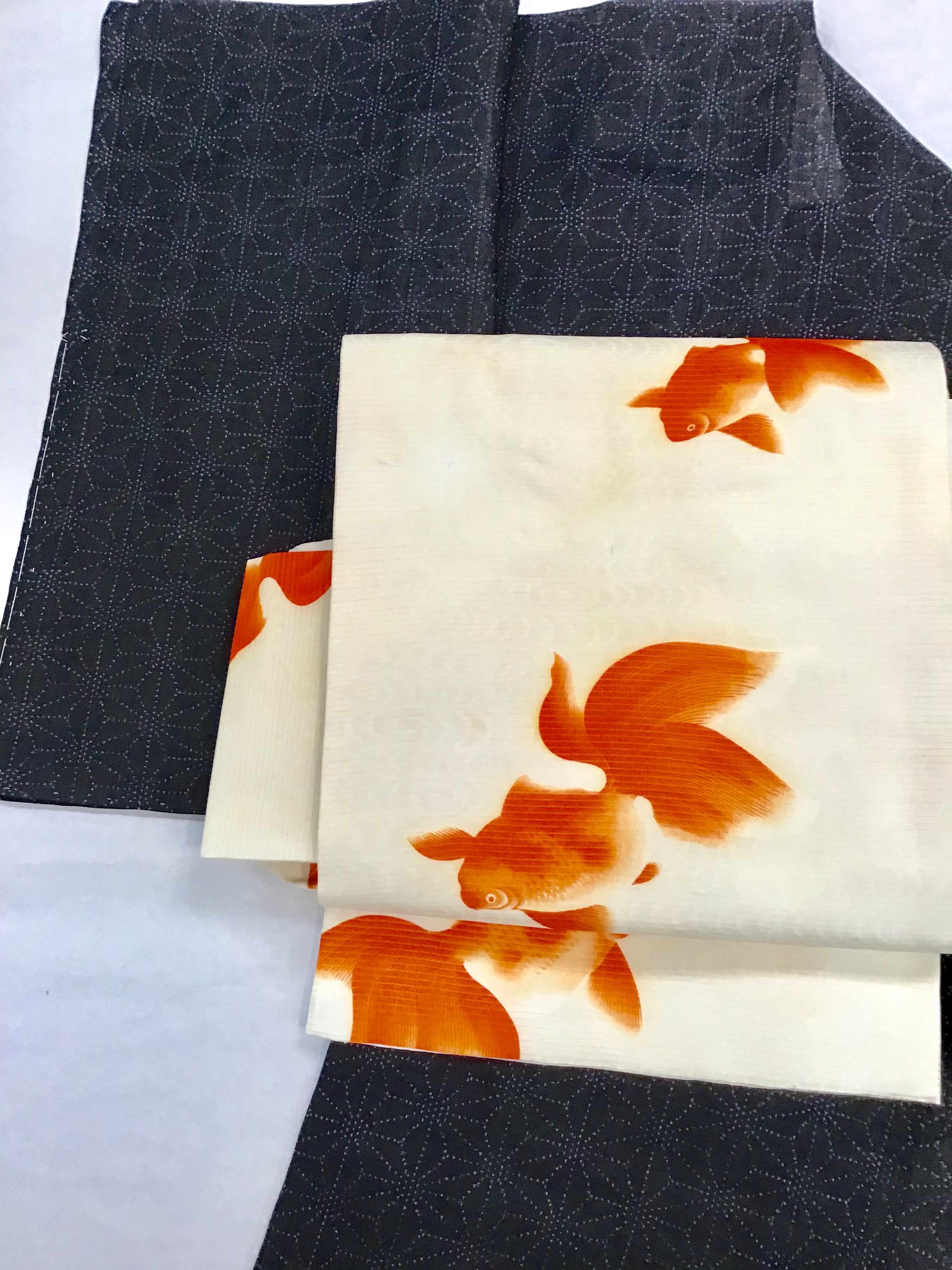 最後にご紹介するのは、大きな金魚がのびやかな名古屋帯で印象的な装い!