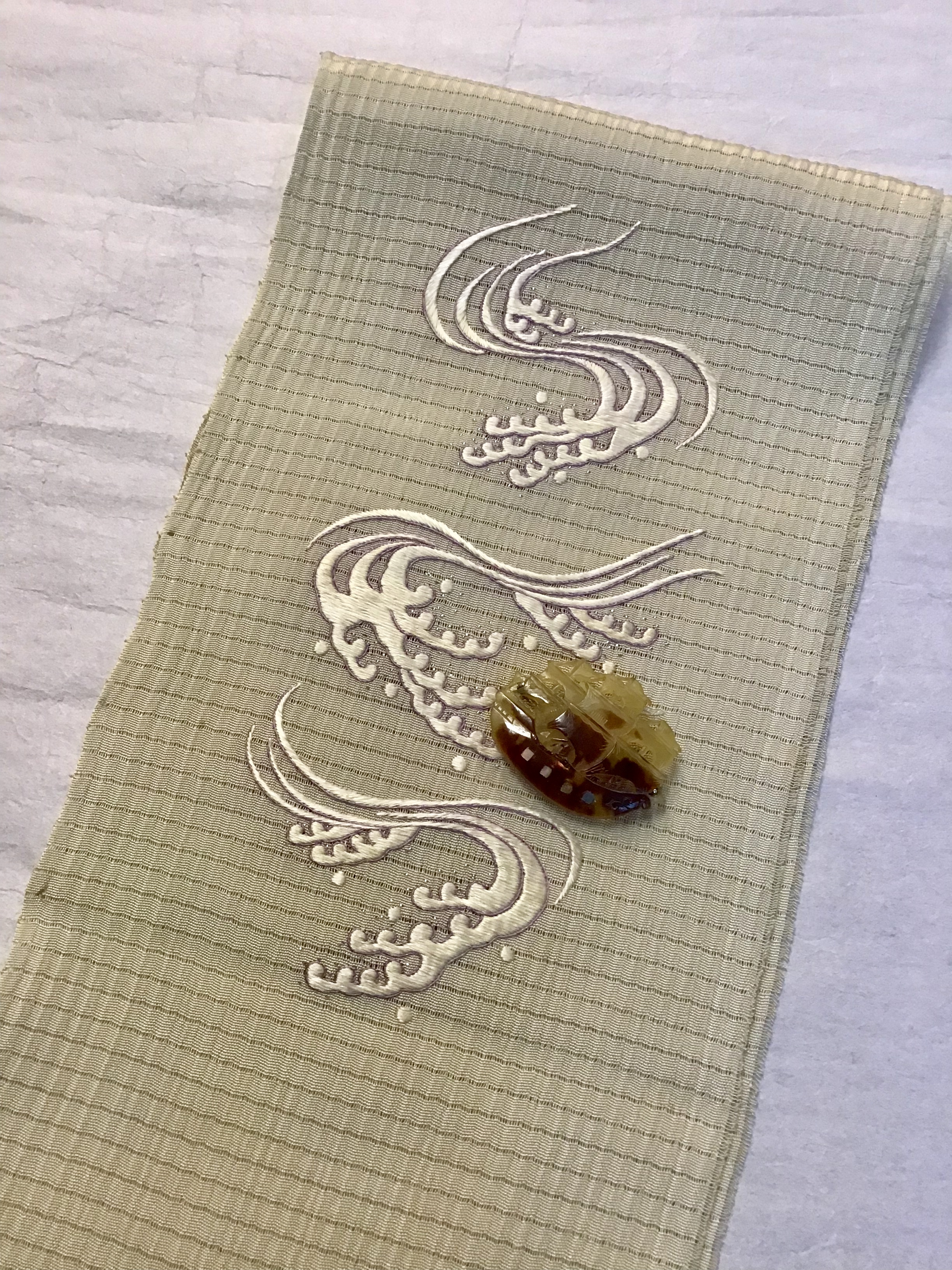 半襟祭りの最中ではございますが… 新入荷の半襟もご紹介! 重厚な波の刺繍の夏用半襟と 波間にどんぶらこと浮かんでいるは鼈甲お船の帯留です。。 絽縮緬半襟 8,000円+税 鼈甲お船の帯留 28,000+税 その他新入荷半襟ございます。また後程。。。
