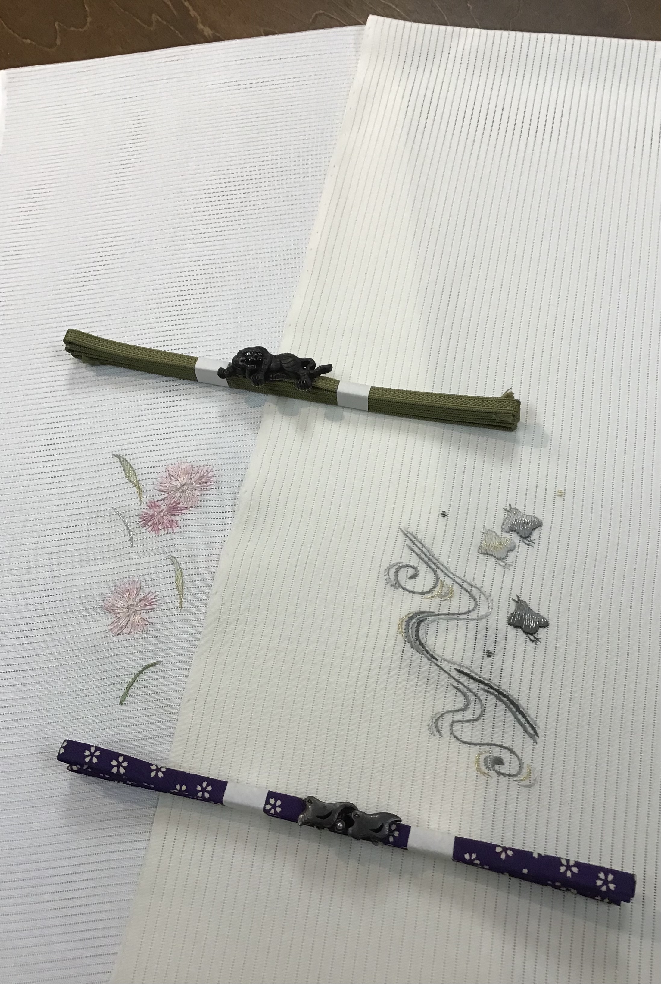 これからお役立ち、撫子の刺繍半襟と波に千鳥の刺繍半襟の上には…