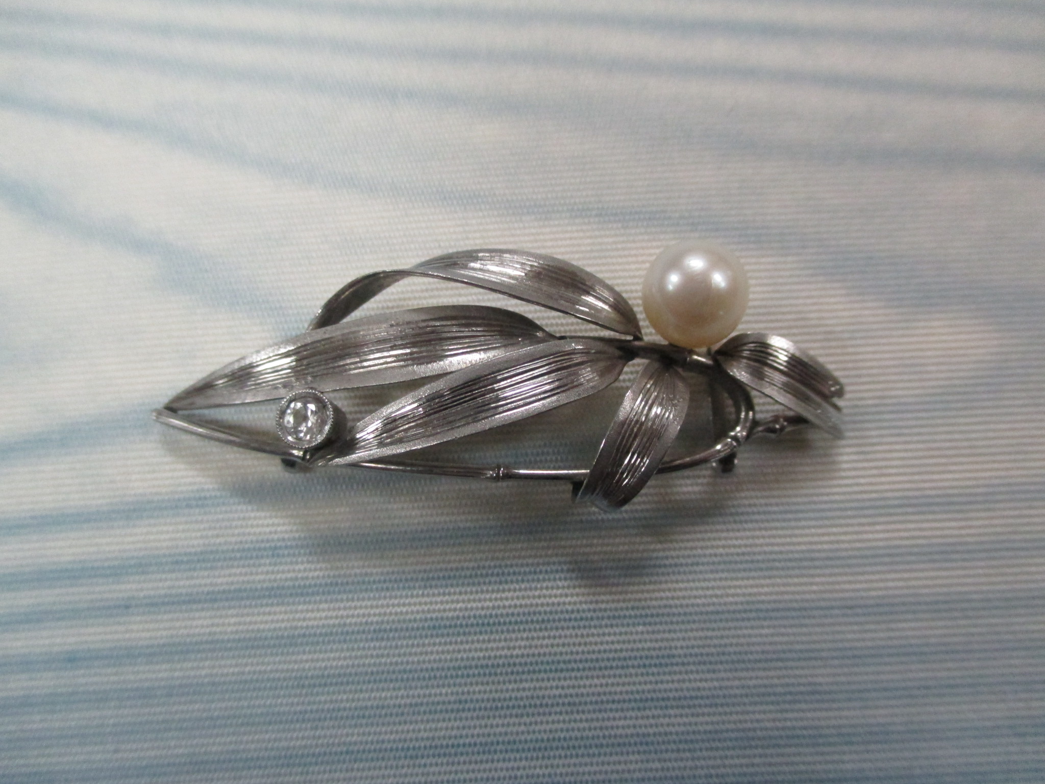 葉脈まで極ミリ幅で彫り込まれた笹の葉に、一粒の真珠とガラスが、夜露のように見えます。