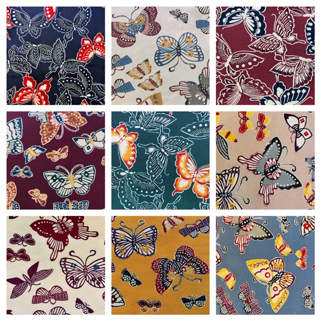 浦野さんの小紋といえば、蝶々や唐草、流水に千鳥、大輪の椿や菊、牡丹、かわいい小花の数々、かと思うととんでもない抽象柄まで揃っています。