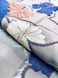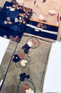 着物の地紋には花菱が織り込まれ、紗綾形の文様が染抜きになったうえに菊や楓が型染めされた、職人技が重ねられた着物です。