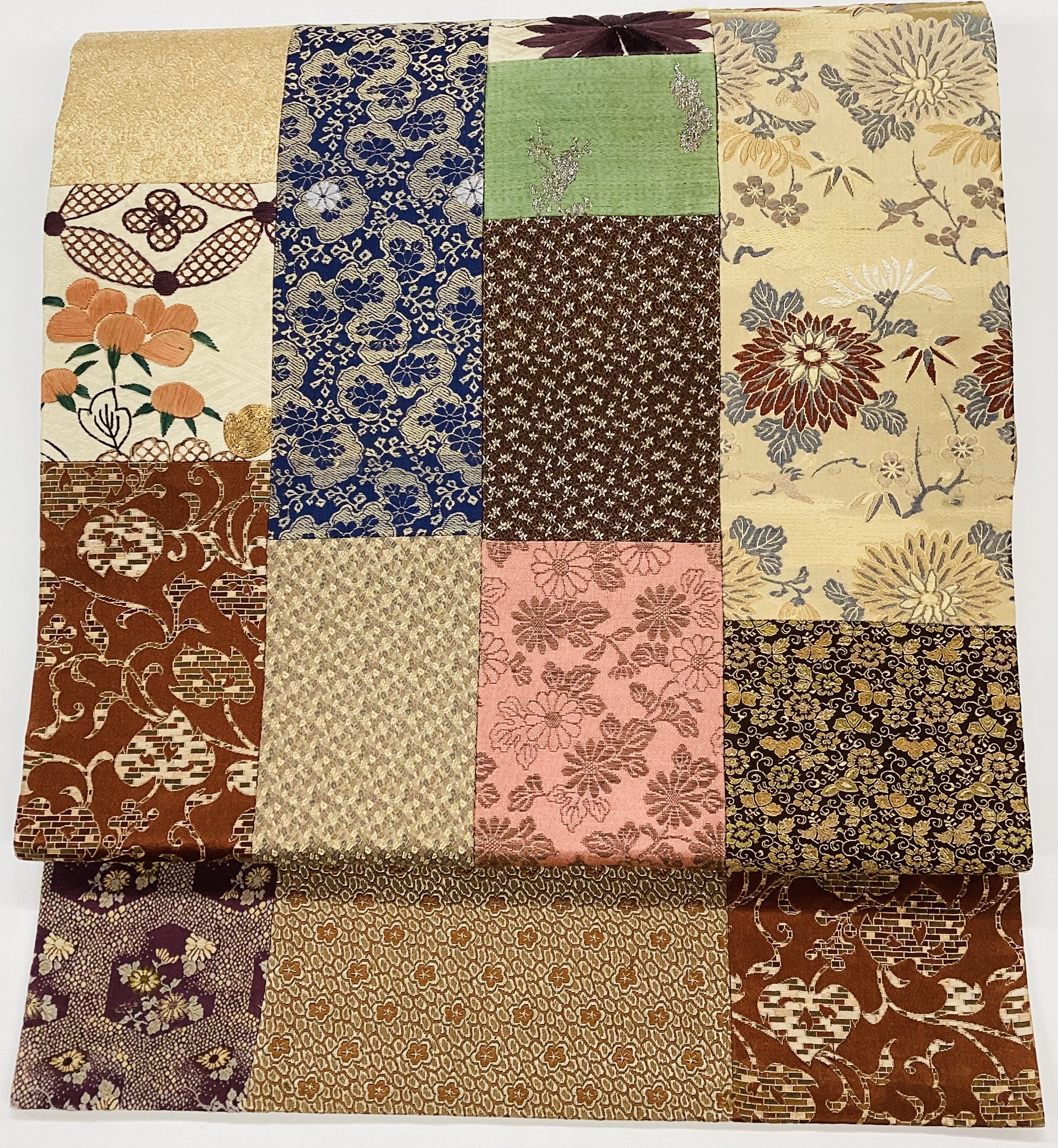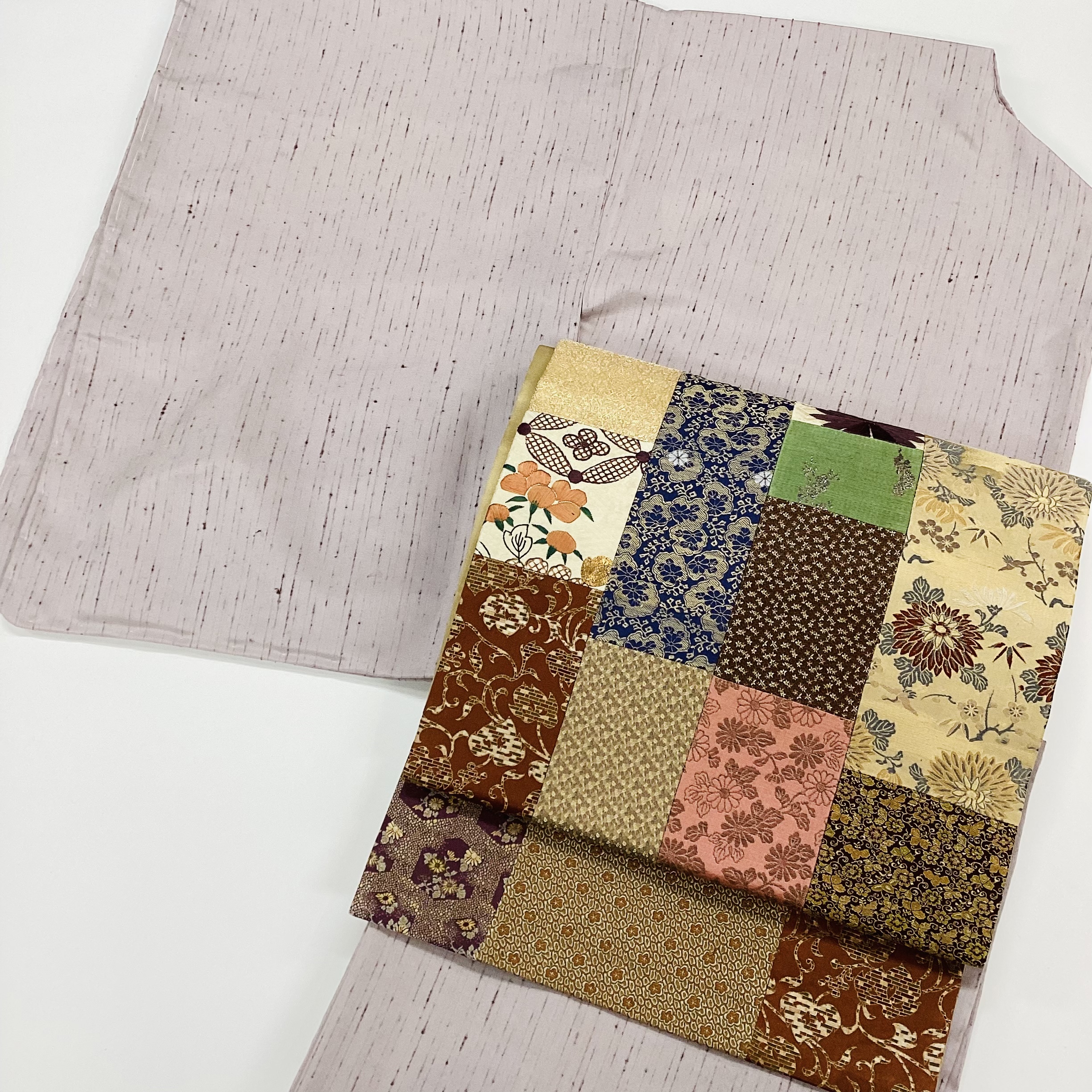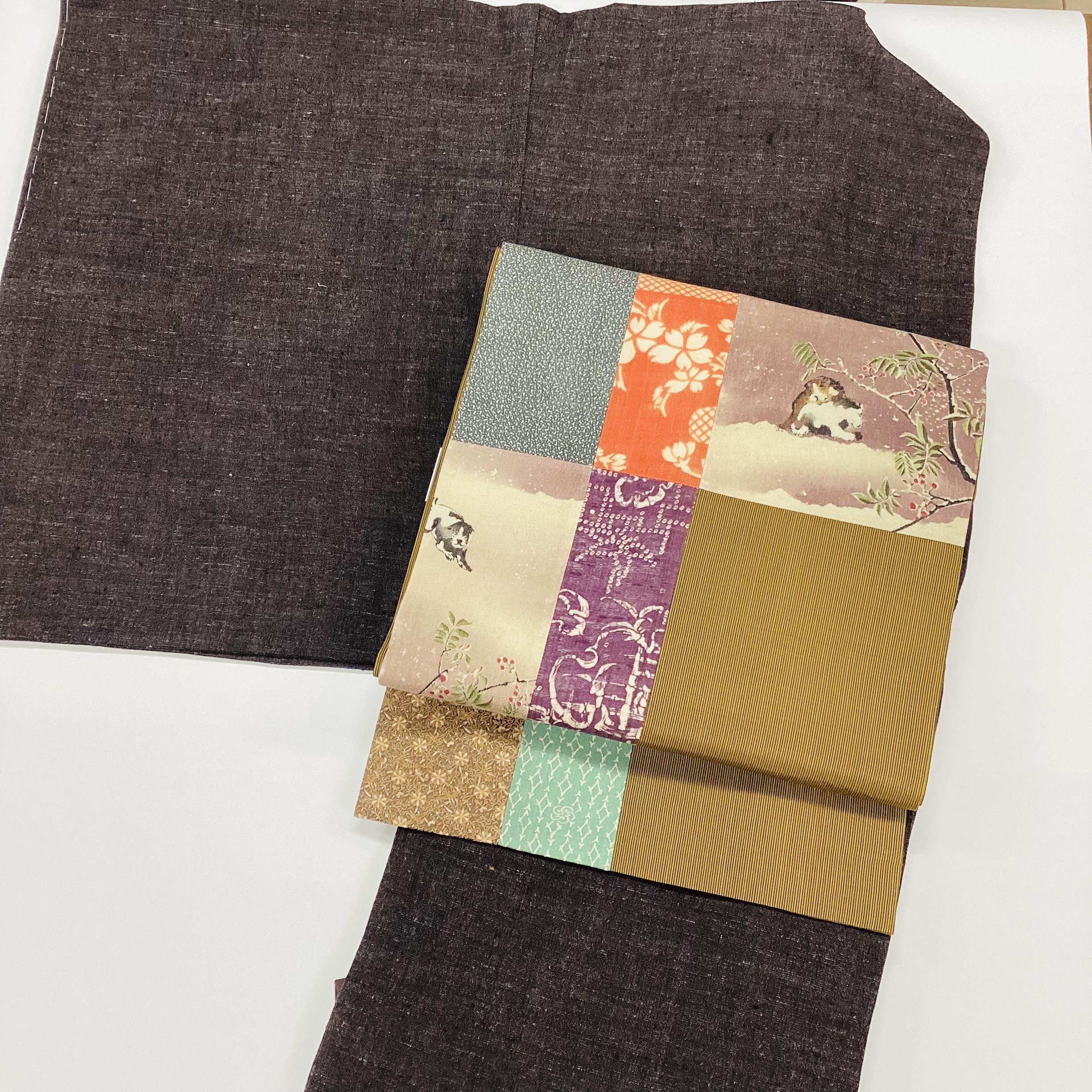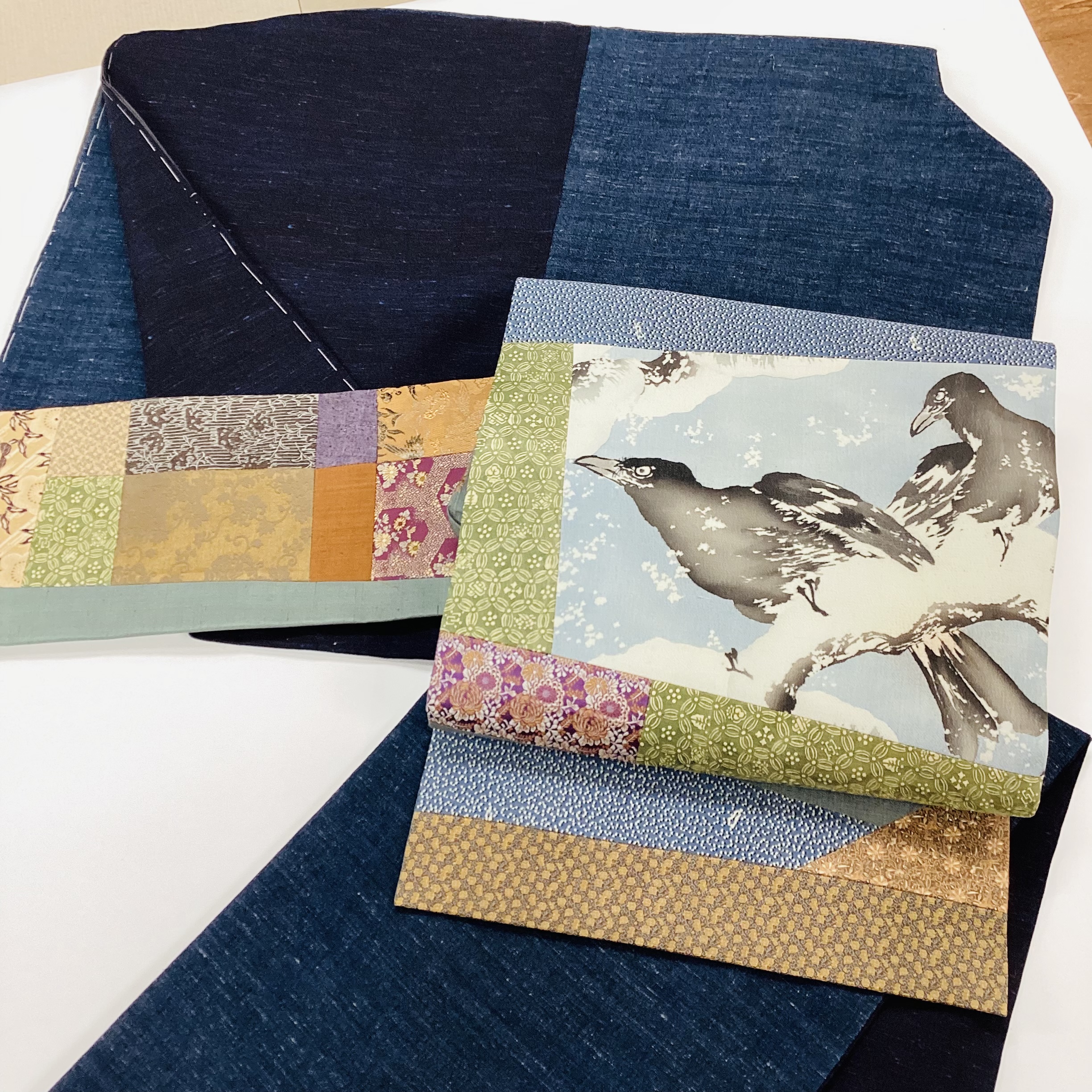 今は在宅で、主に、コラージュや継ぎ帯を創作しています。