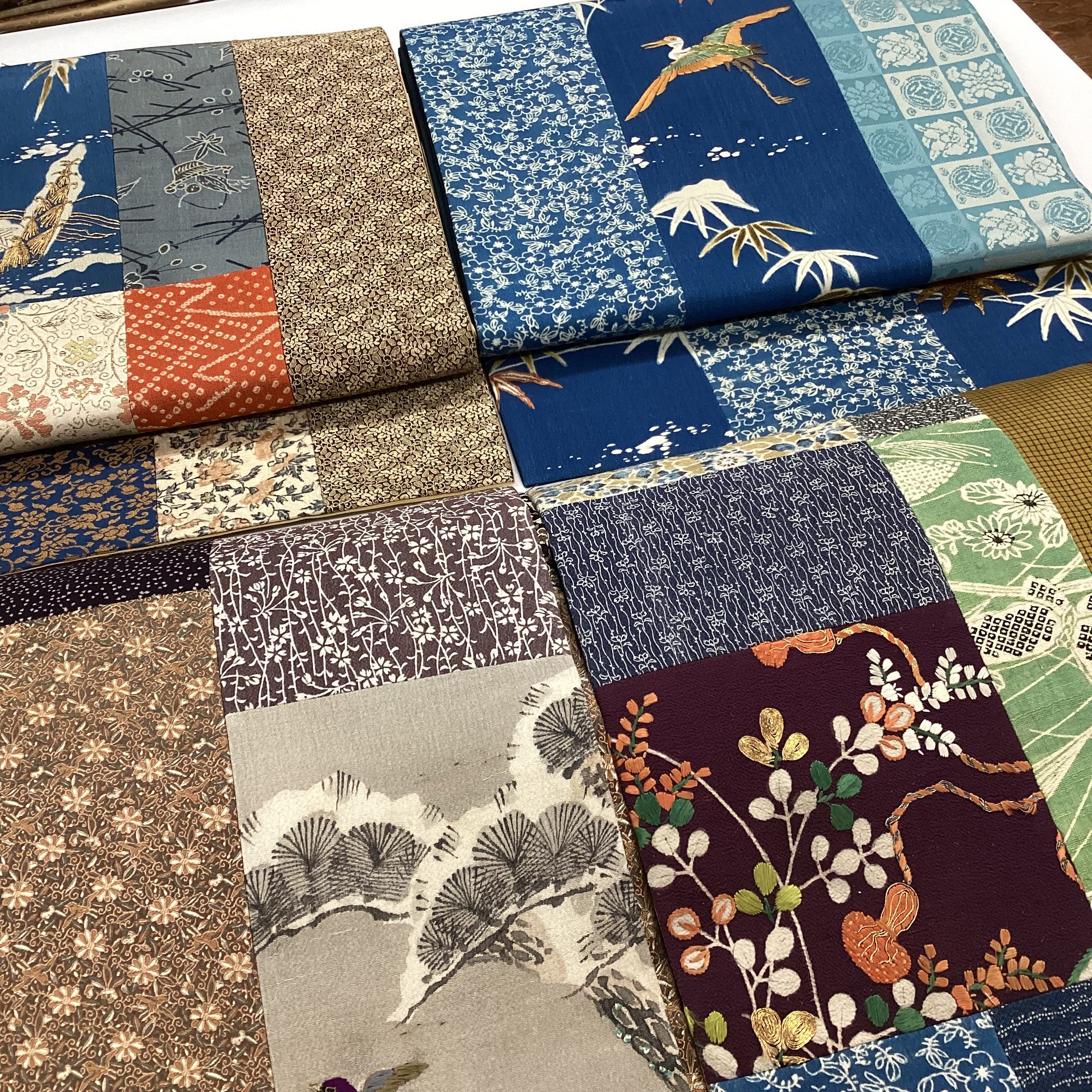 江戸縮緬や更紗、外国布、味のある昔の紬にビーズも入って、楽しく個性溢れる帯たちが仕上がって行きます。