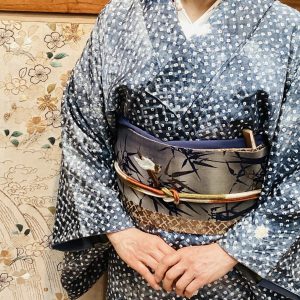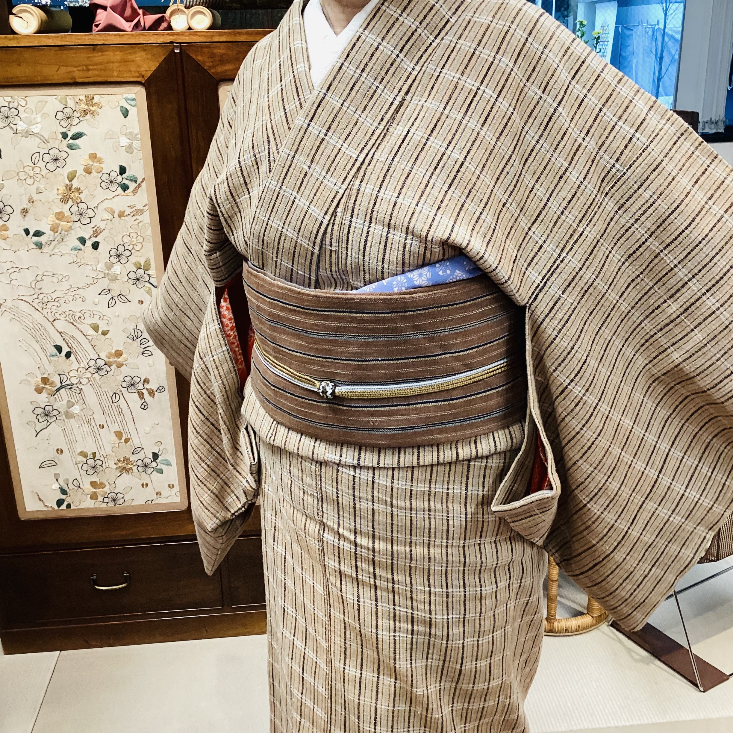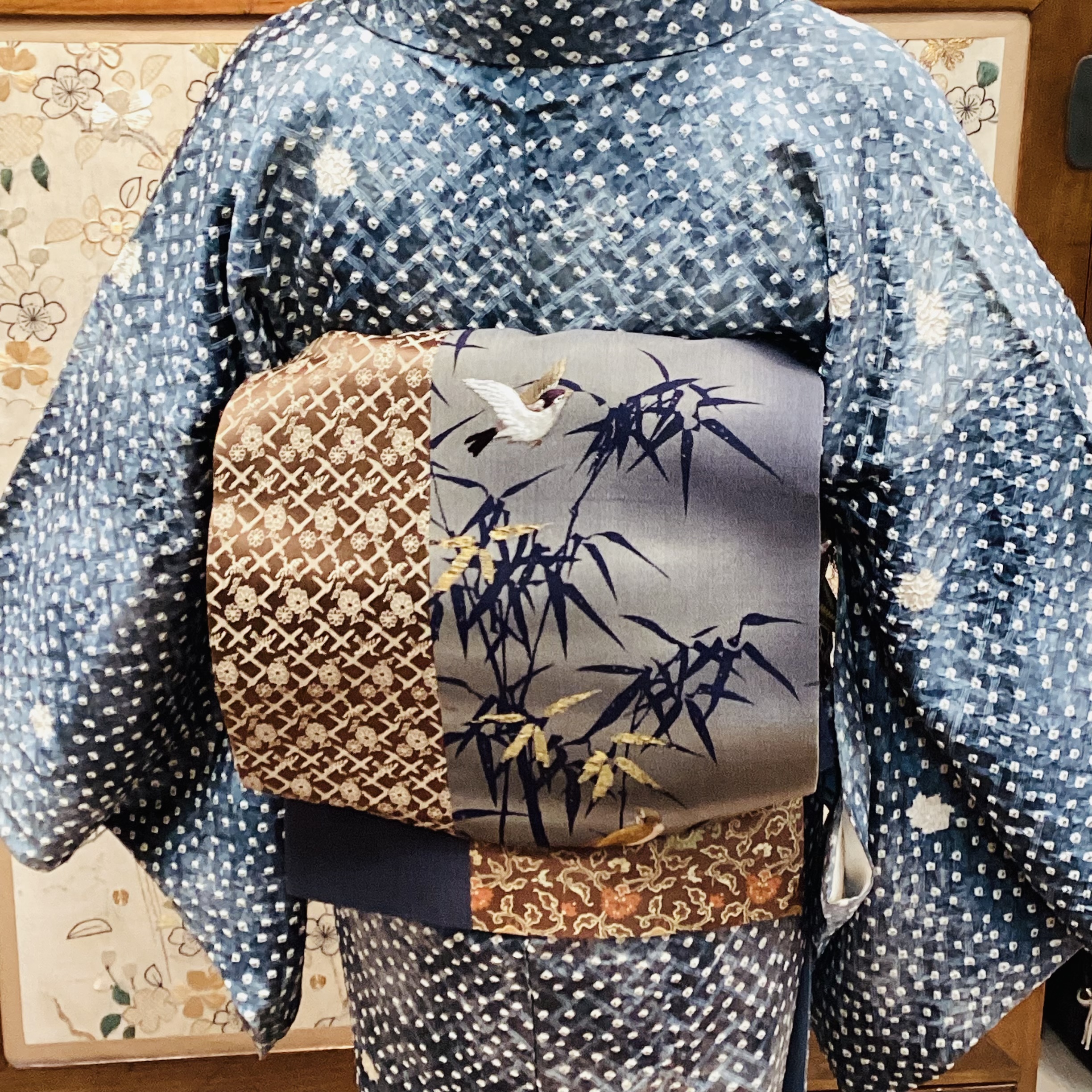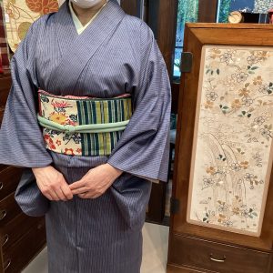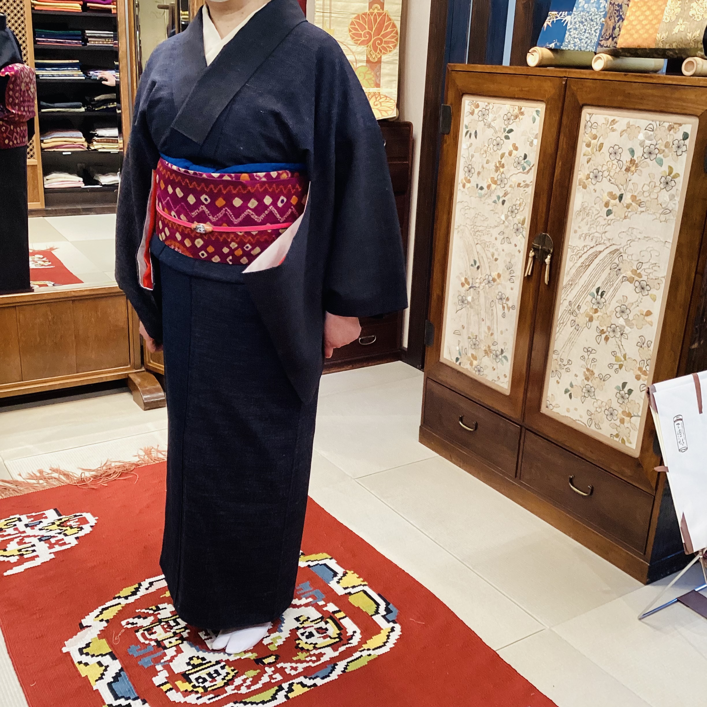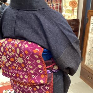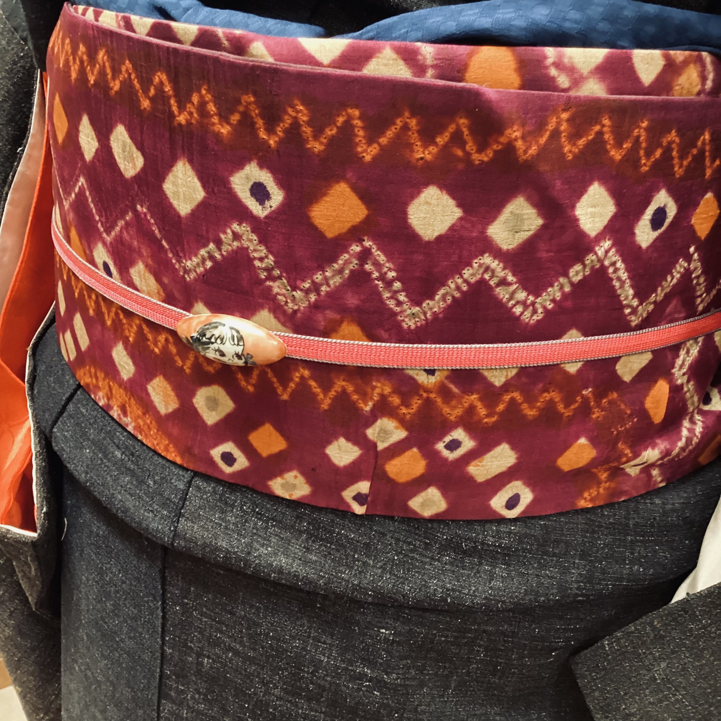 次のお客様は灯屋2自慢の結城縮の継着物に時代を経たインドネシア、プランギンの帯。