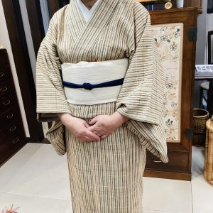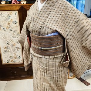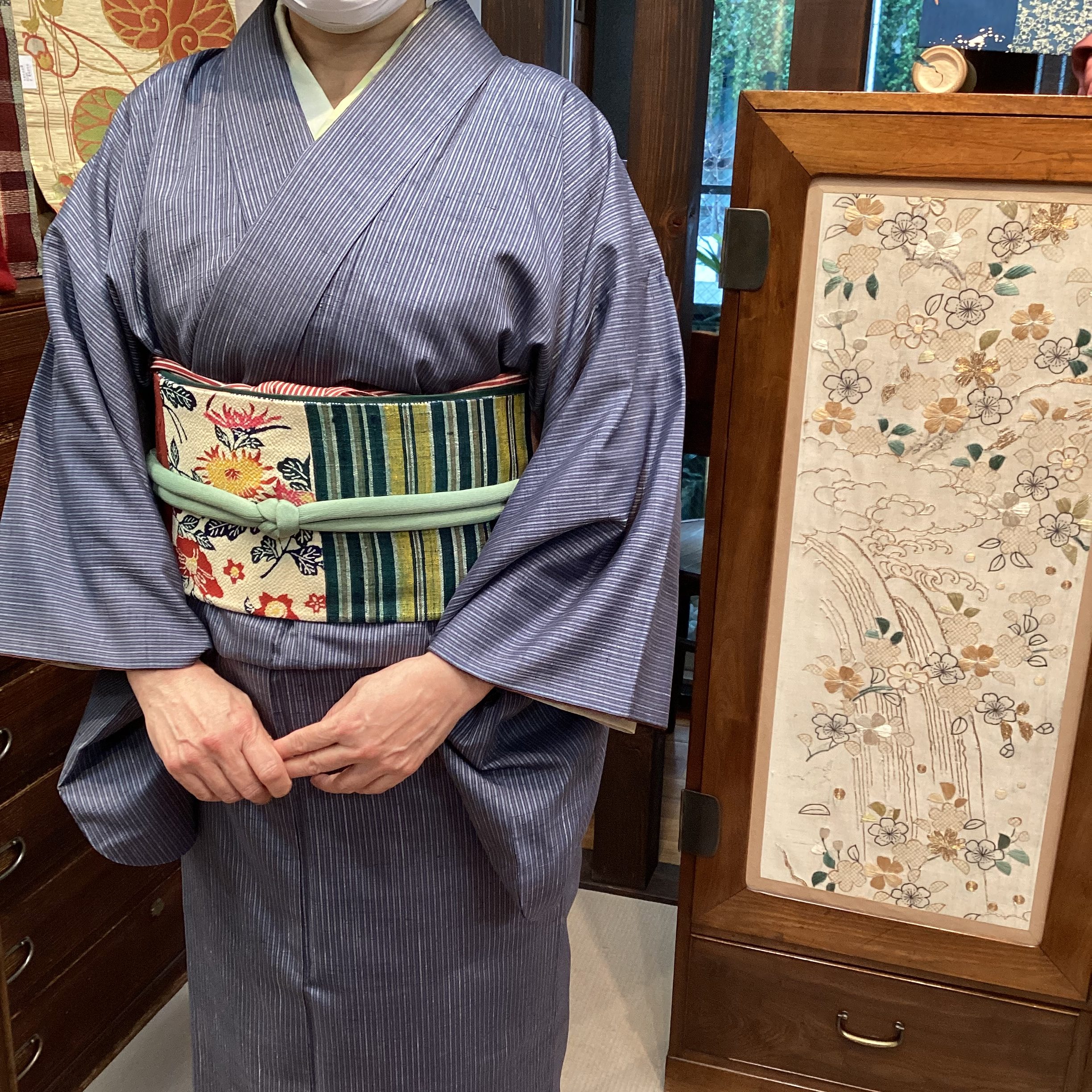 そしてこちらのお客様はこなれた縞の紬に和更紗の帯。
