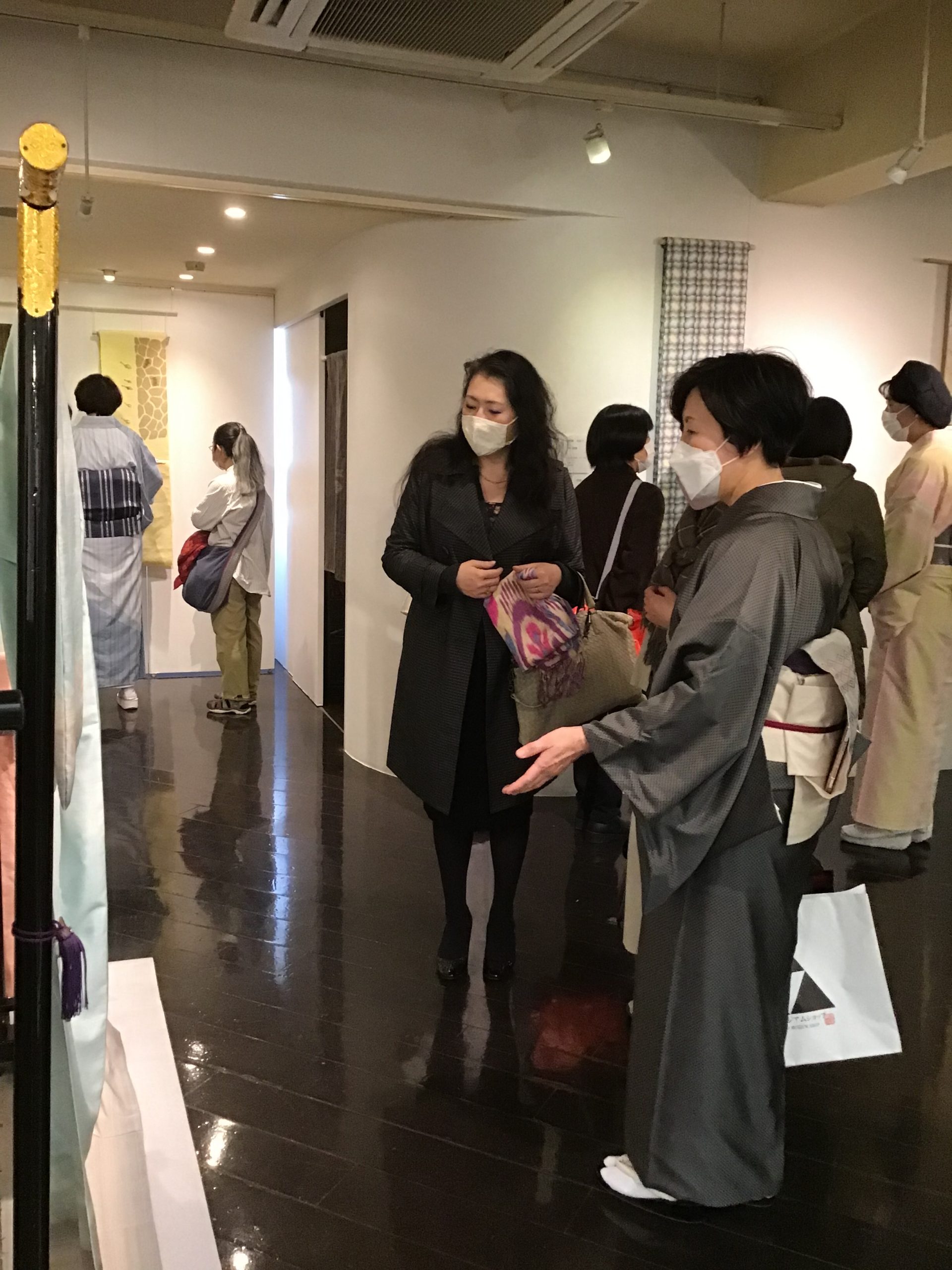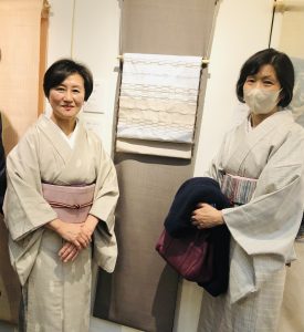 作品とご一緒の桑田さん(左)とお客様。お召しになっている着物は、最初に織られた作品とのこと。素晴らしいですね。会の名前は絋遊会。