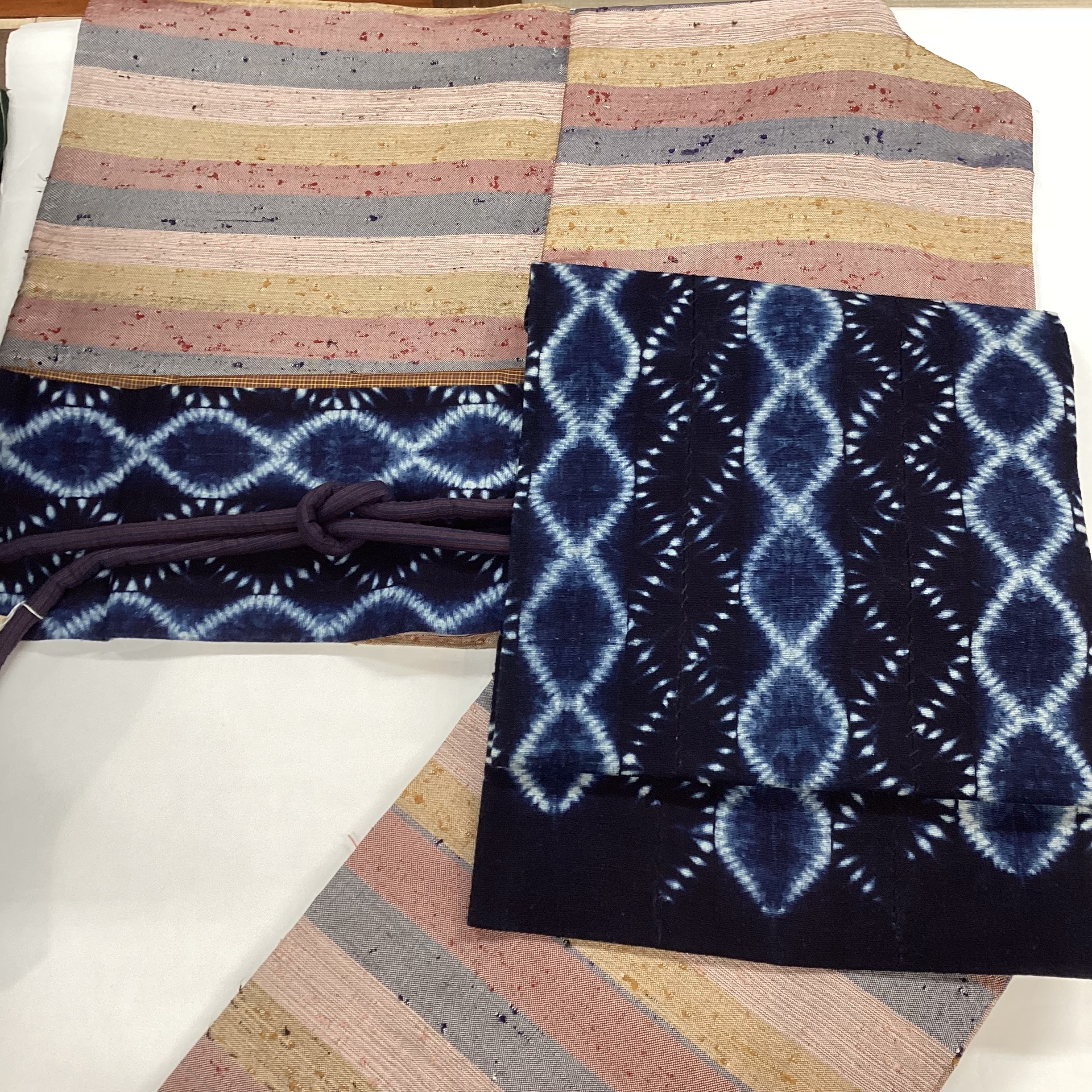 それを3枚繋ぎ合わせて帯にしています。新入荷の綿唐山の丸ぐけを合わせて。