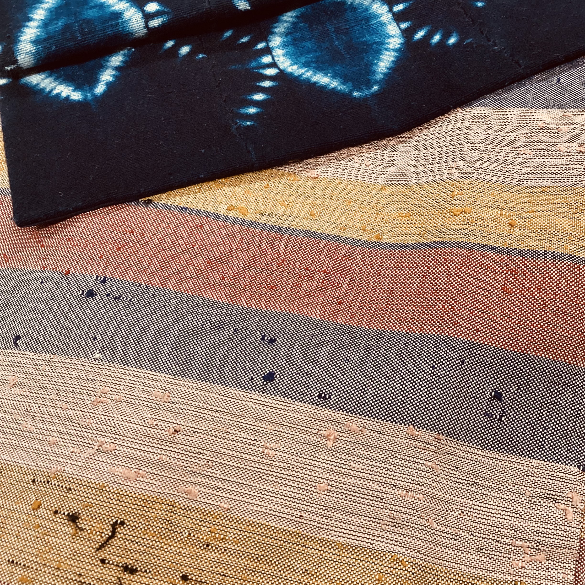 お客様の究極の手仕事にインスパイアされて、本日ご紹介するのは、伊兵衛織の着物と当店で現地で買い付けたアフリカの布で作った帯の組み合わせ。