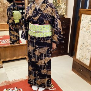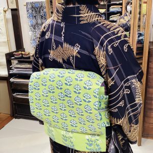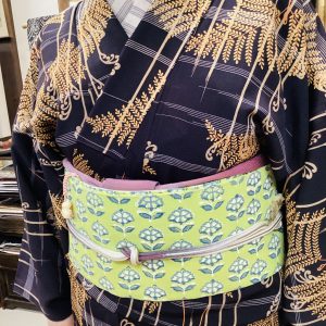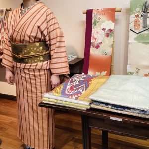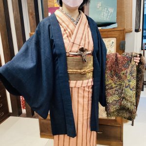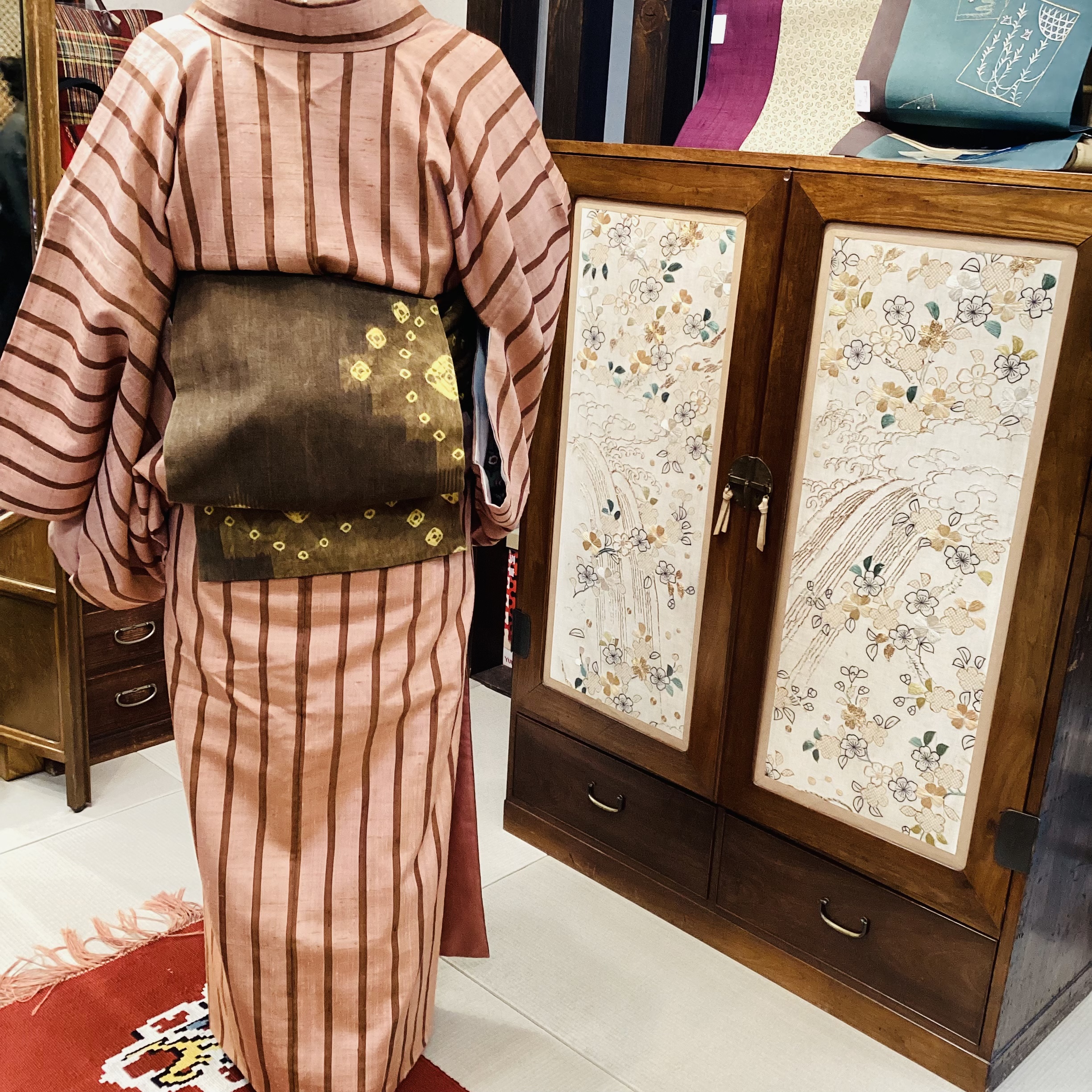 次のお客様は大胆な縞の着物にインドネシアのスラヴェシの絞りの帯