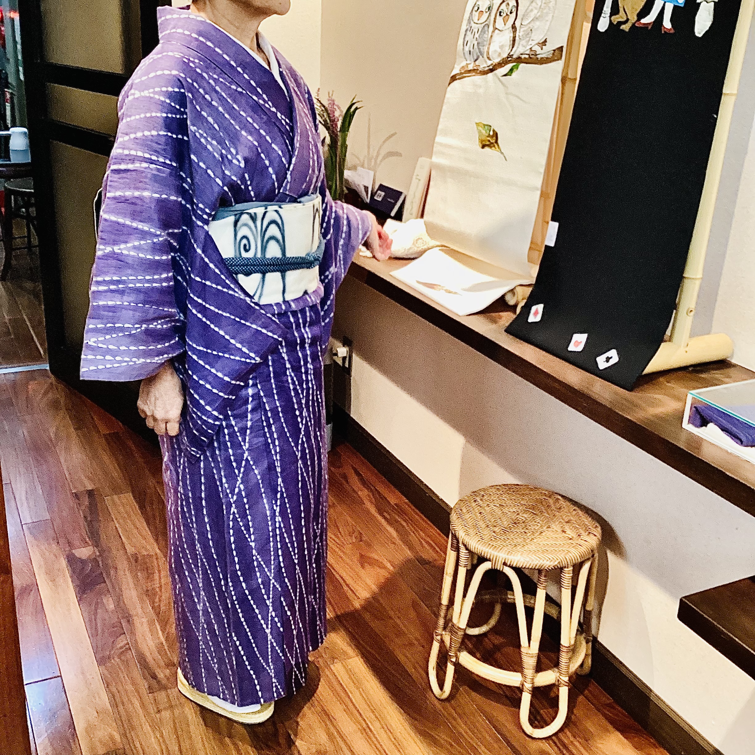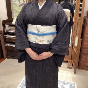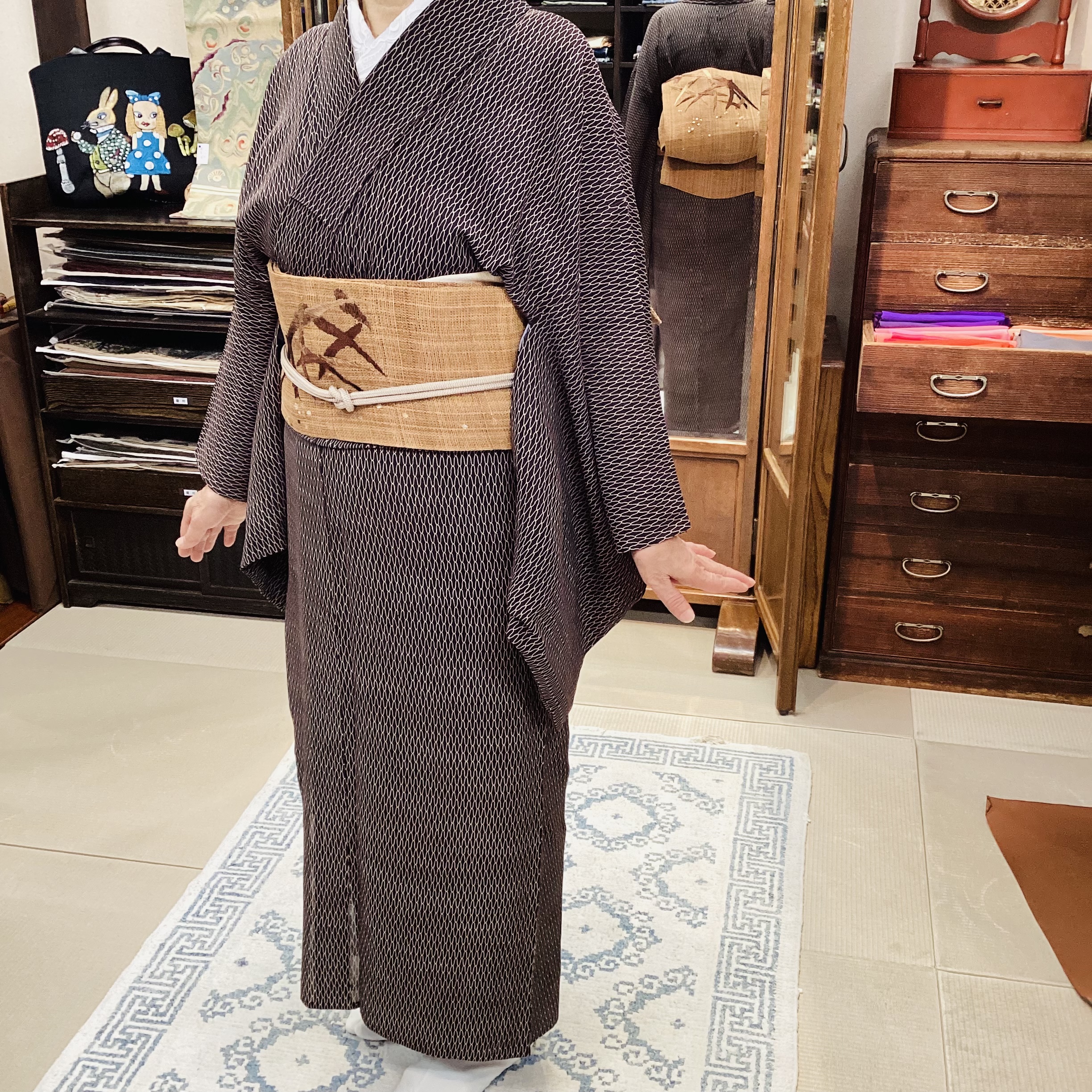 次のお客様は、透け感の少ない細かい縞の麻の着物に麻の帯。秋へ向かう季節の谷間は、色はダークに素材は涼しく!