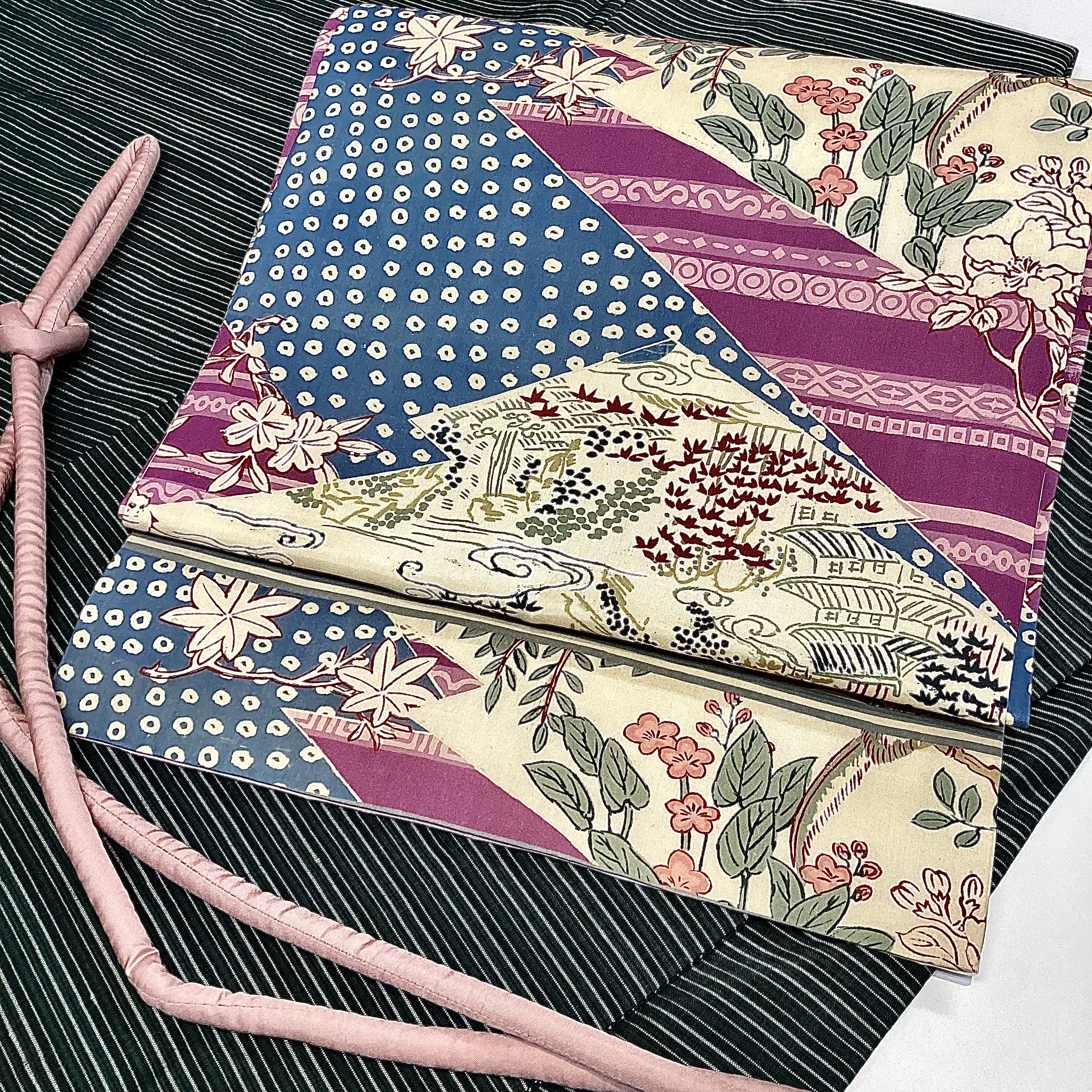 次にご紹介するのは、和洋の柄が切り嵌めのように染め分けられた帯。色合いはどちらかとういうと西洋的。