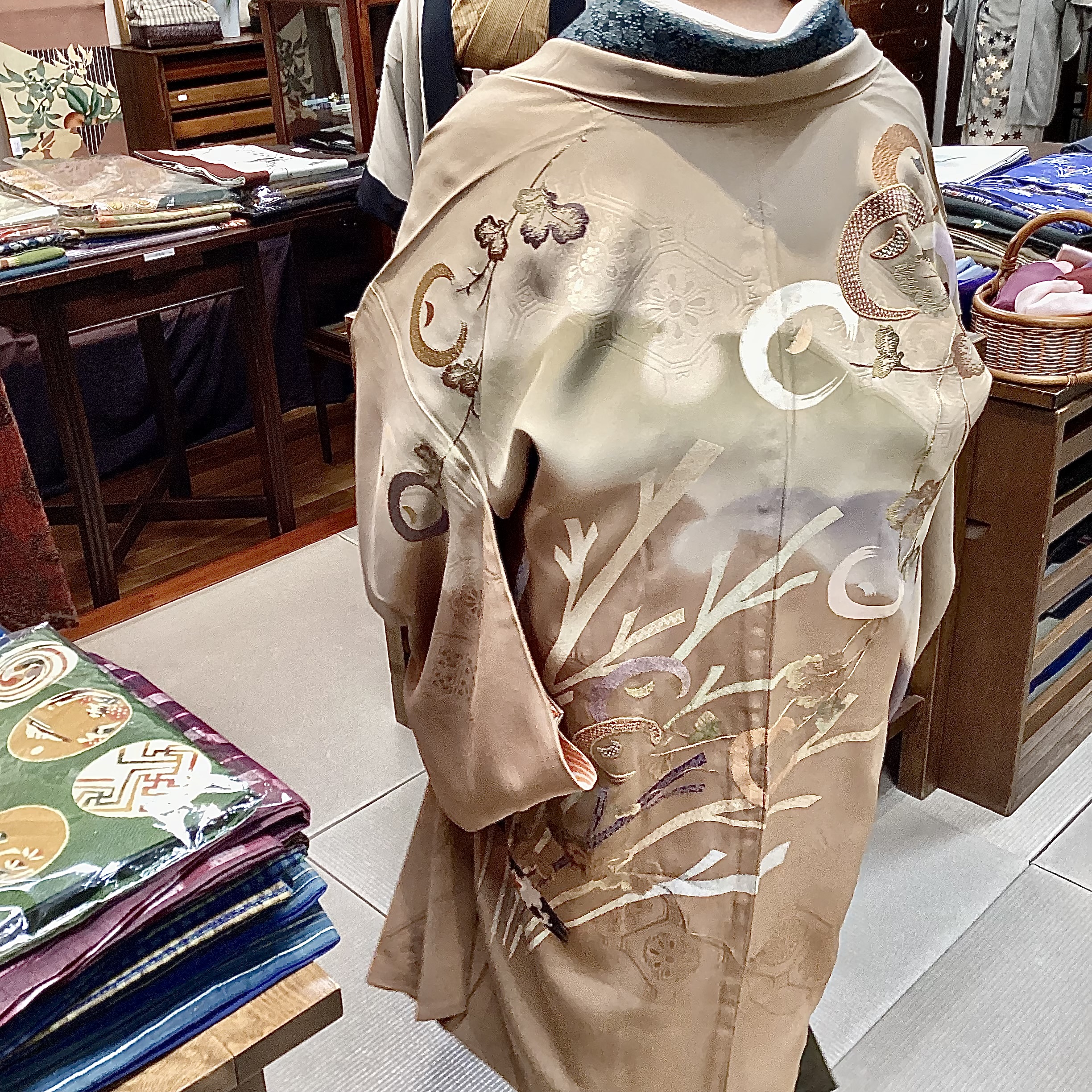 次のお客様も大変凝った羽織をお召しになられています。木々や草花をやや抽象的に描いた秋の風景でしょうか?友禅はもとより、所々に配された凝った地紋、様々な刺繍の技法を駆使しています。