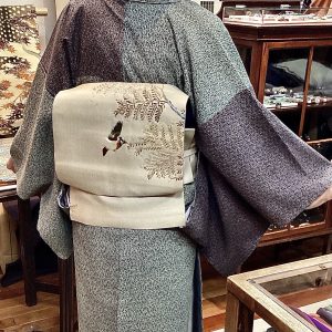 次は「こうげい展」でもご紹介した灯屋2オリジナルの幕末・明治期の江戸小紋でお越しのお客様。色違いの布を継いだ凝ったもの。木々とそれを啄む鳥の刺繍が見事な帯を締められて。上品な着こなしです。