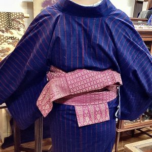 最後は、フラノのスーツような雰囲気のある、縞の上質な紬をお召しのお客様。インドネシアのモール織の帯が華やかです。半幅帯の結び方も可愛く、参考にさせていただきたいですね。