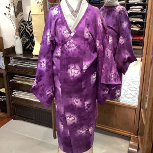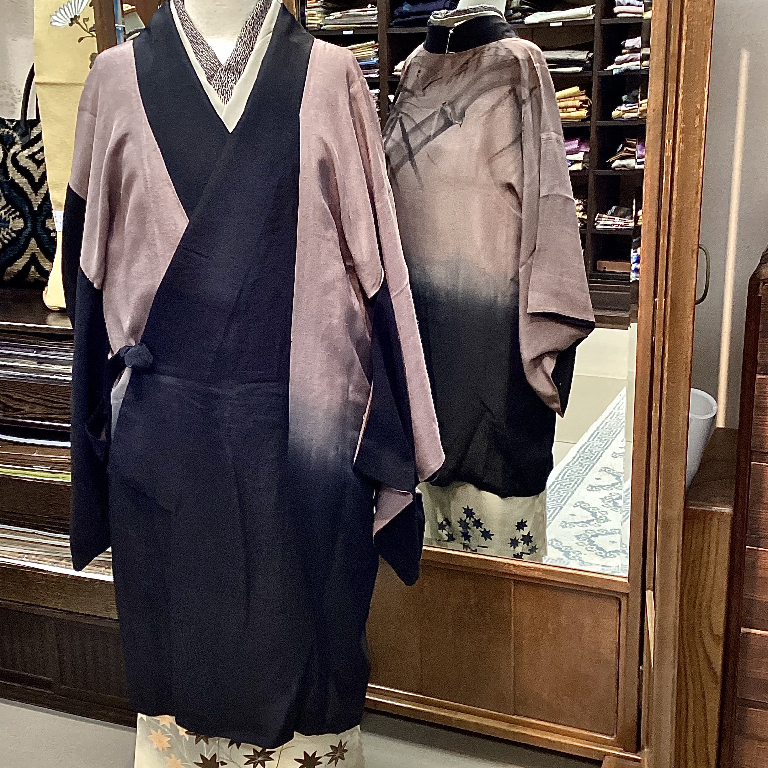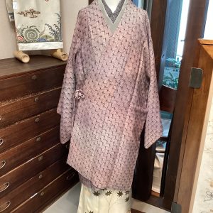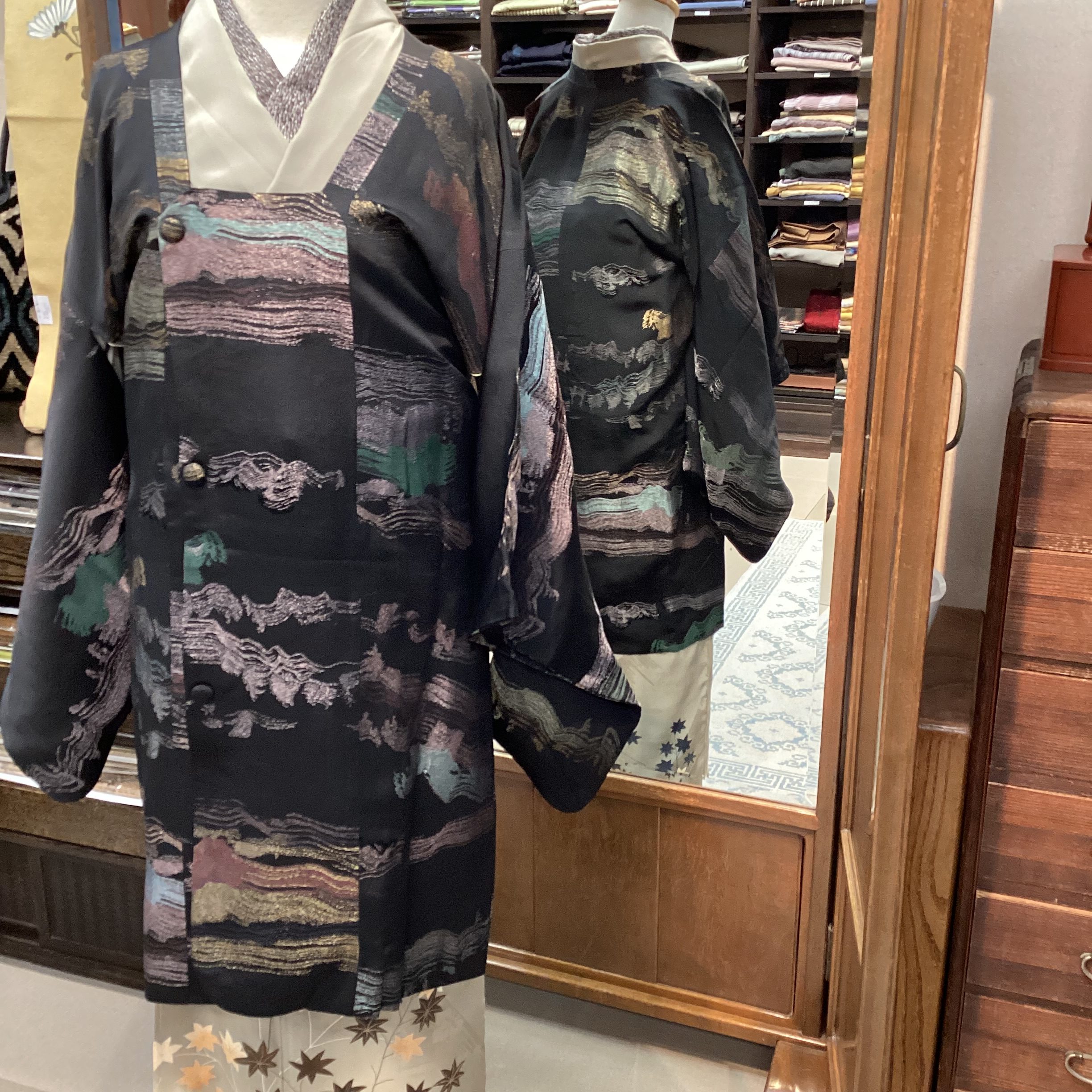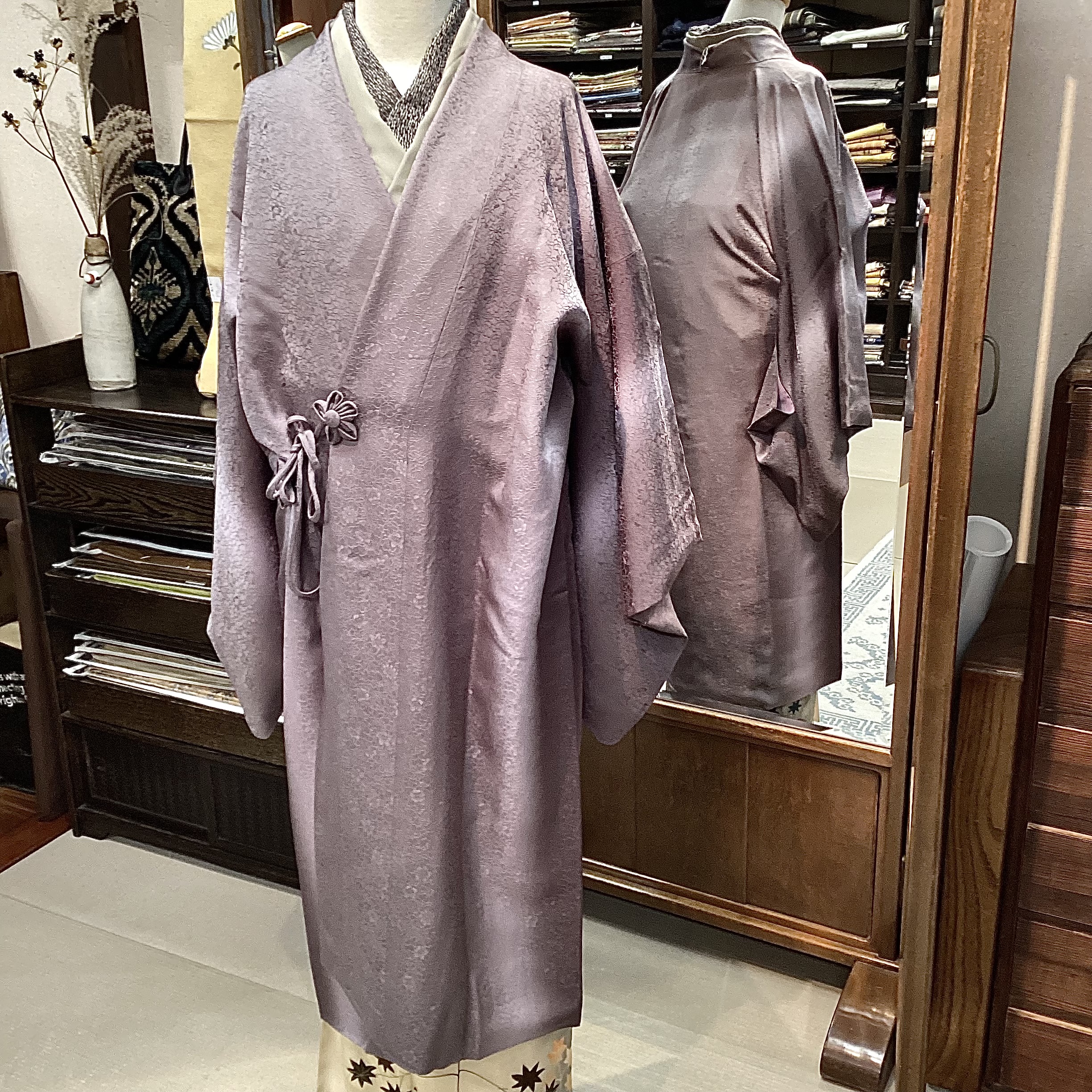 次に地紋が素敵な道中着。色無地や訪問着などきちんとした着こなしにも。裄1尺8寸、49,500円。