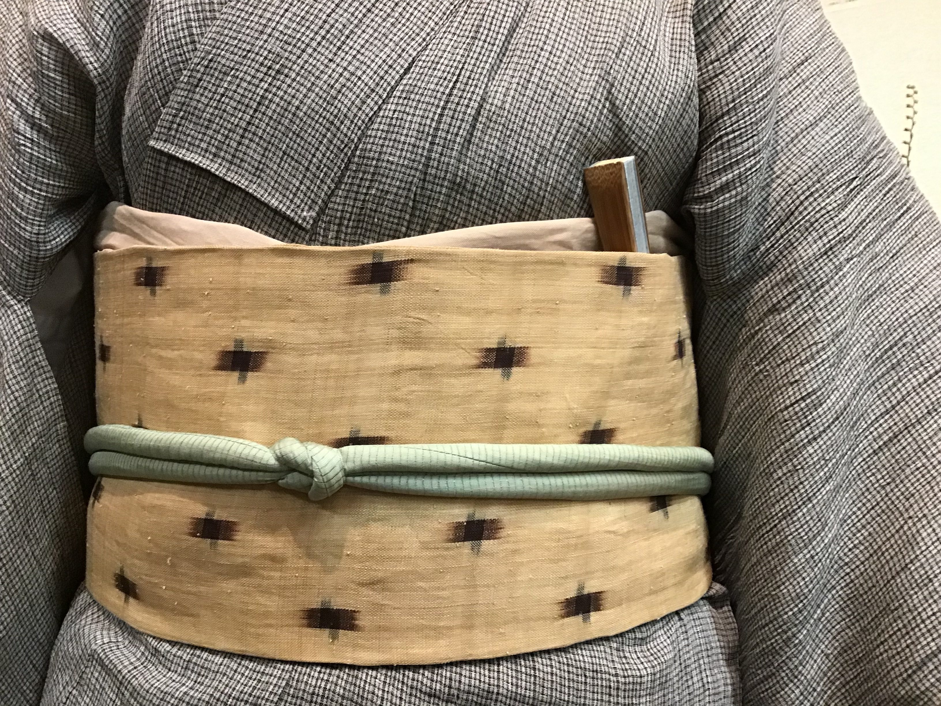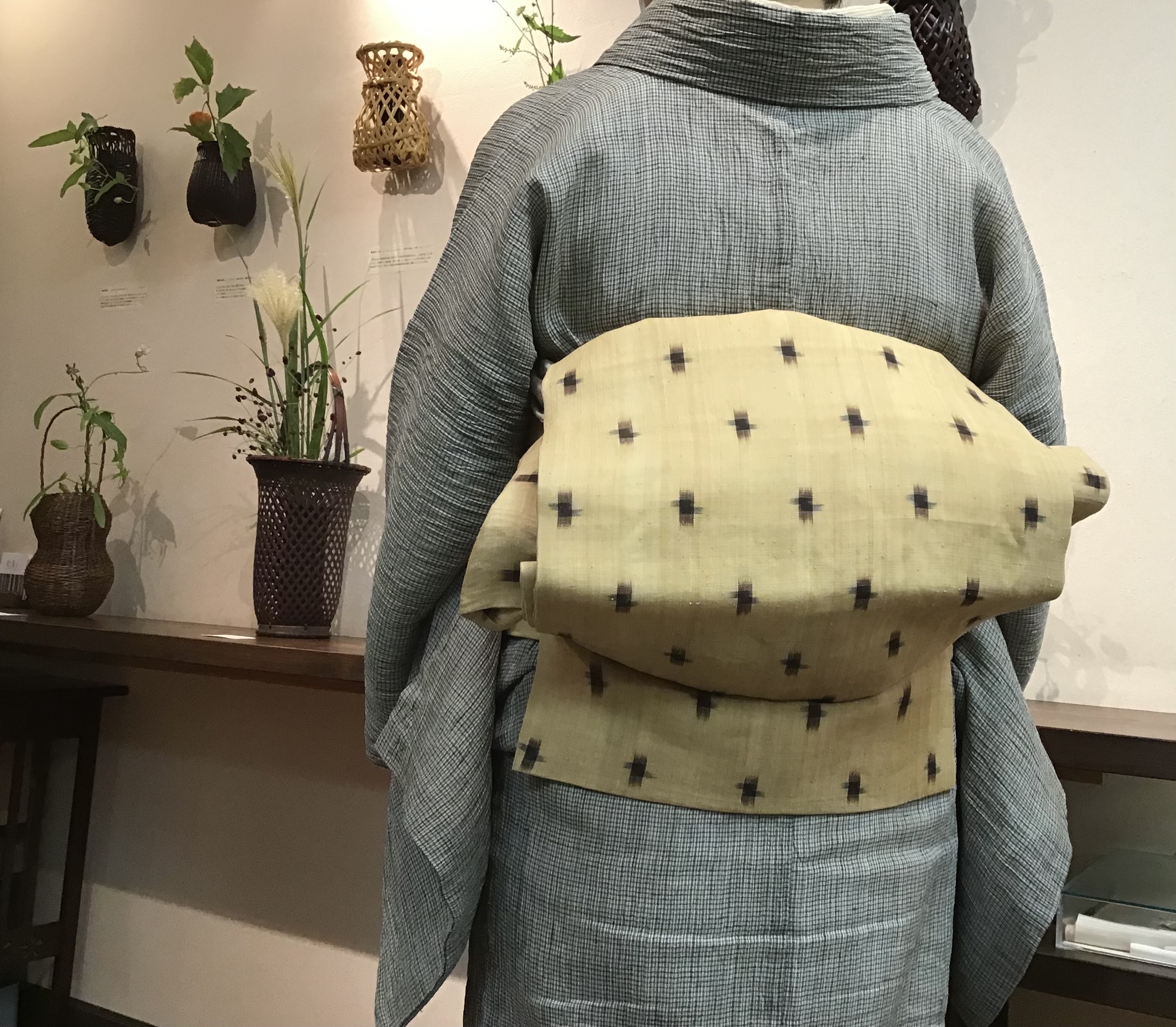 芭蕉布の着物とアフリカラフィヤ椰子のアップリケを付け帯にして、プリミティブアートのような布を纏います。