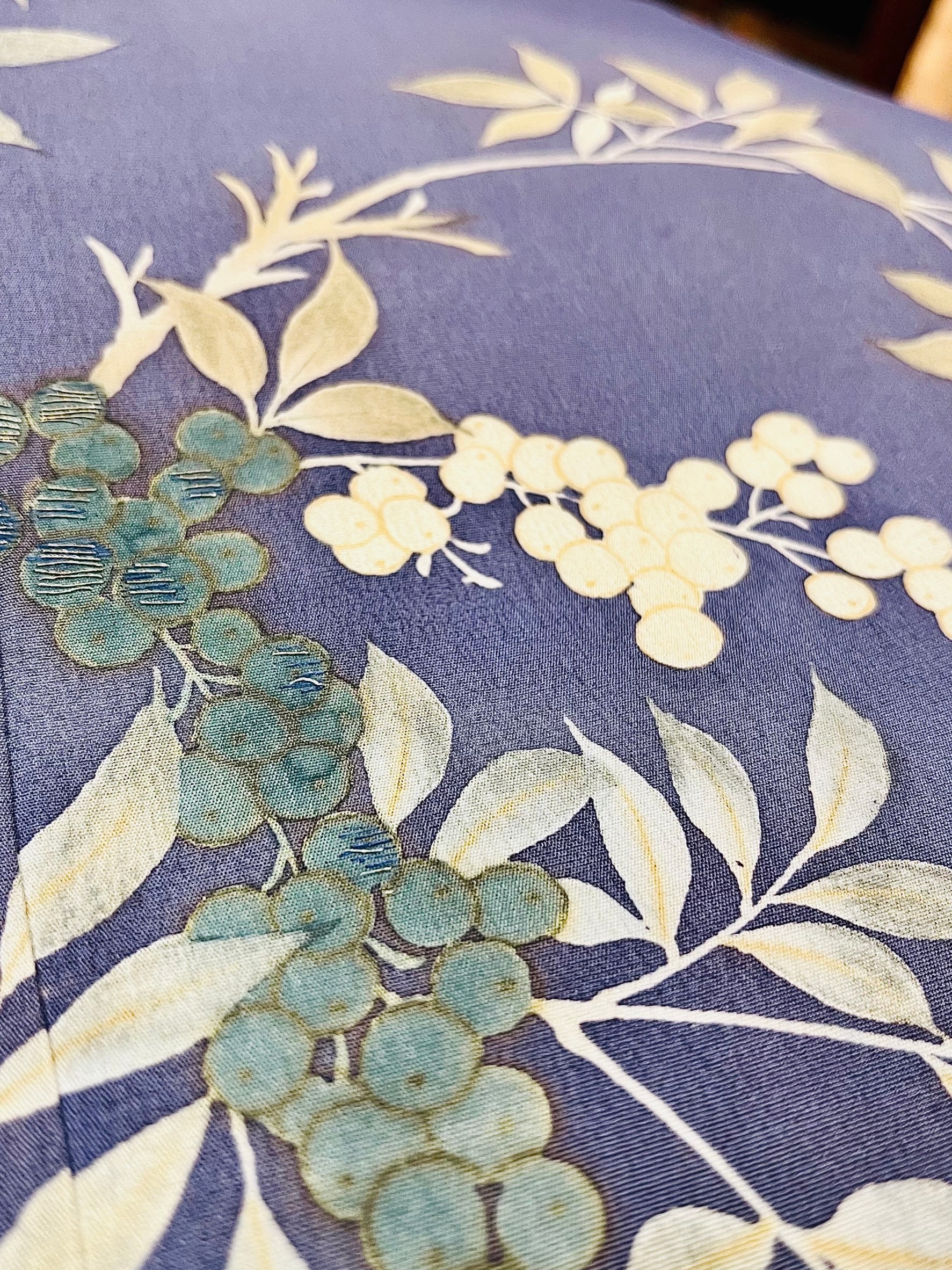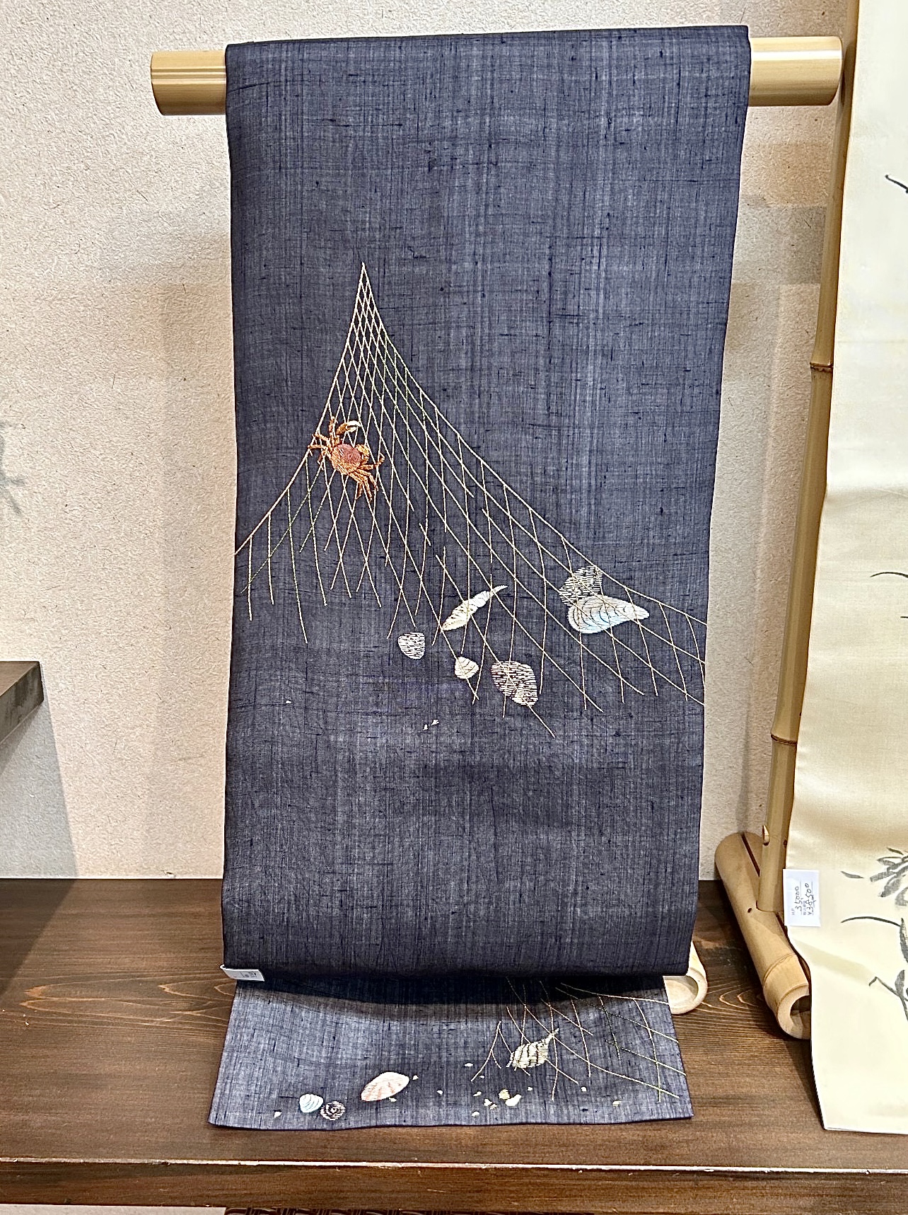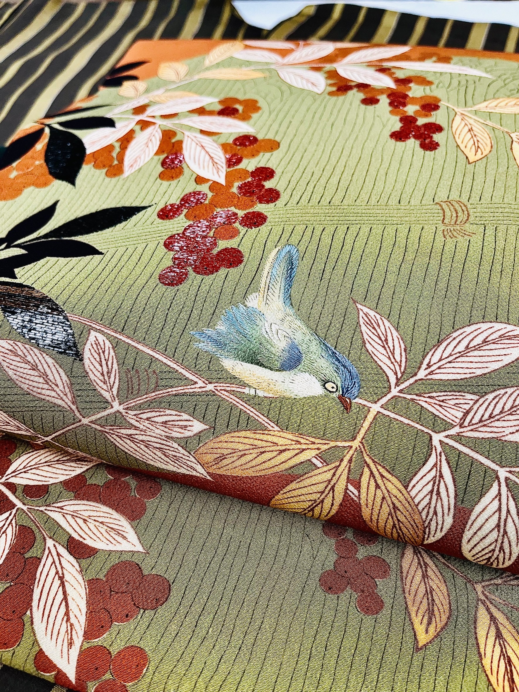 藤の木にとまる小鳥を繊細な刺繍で表現した帯に、伊予染めの小紋を合わせました。