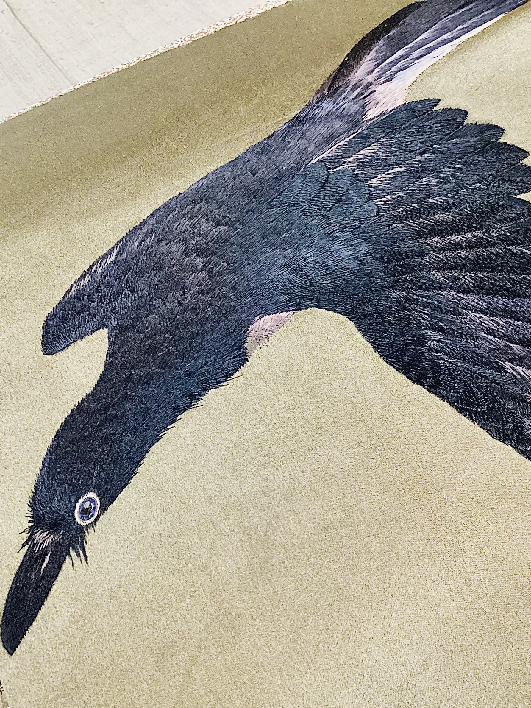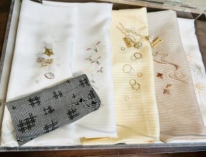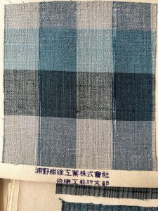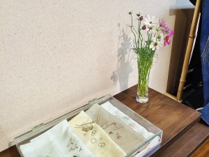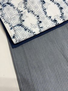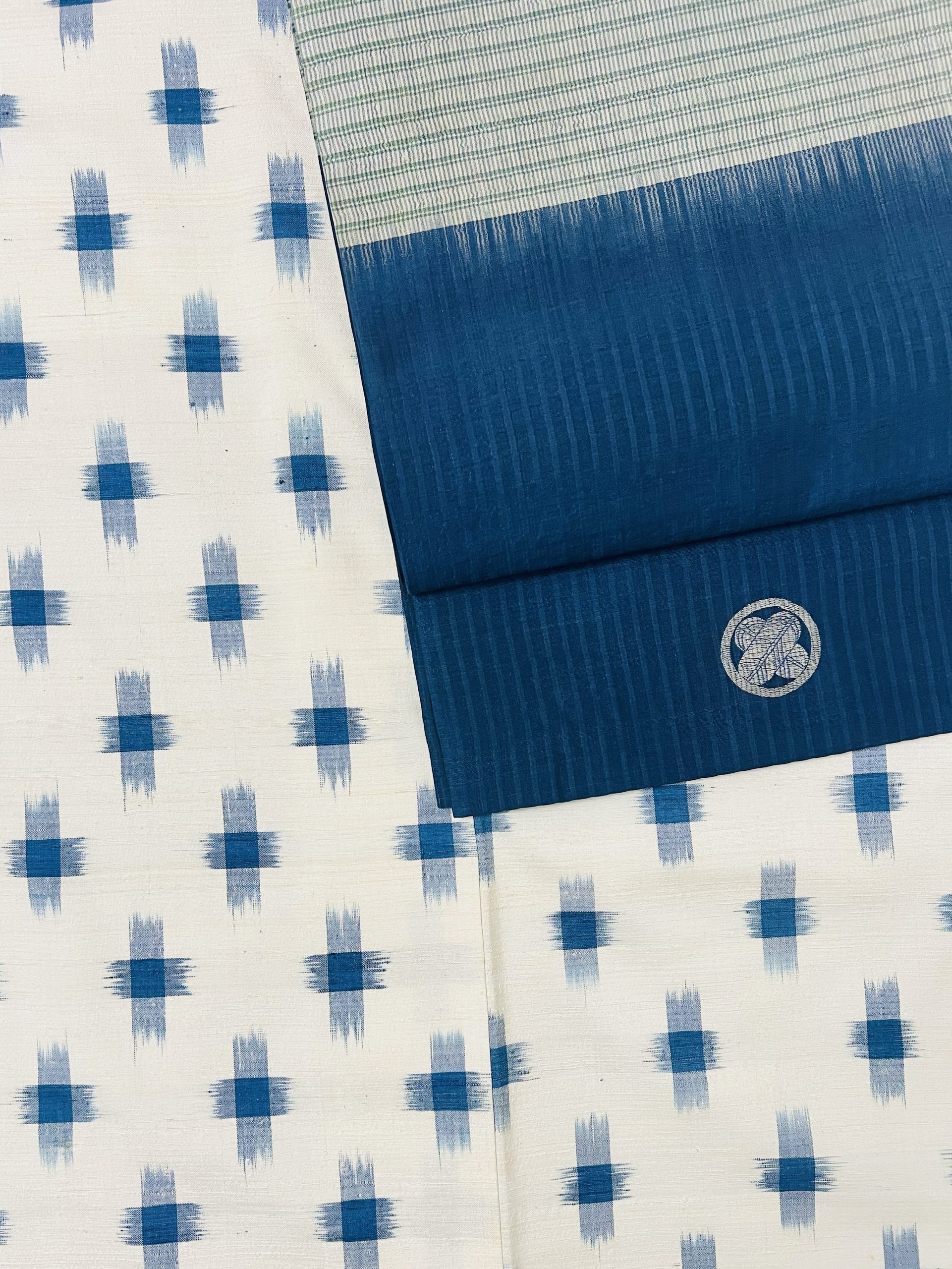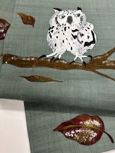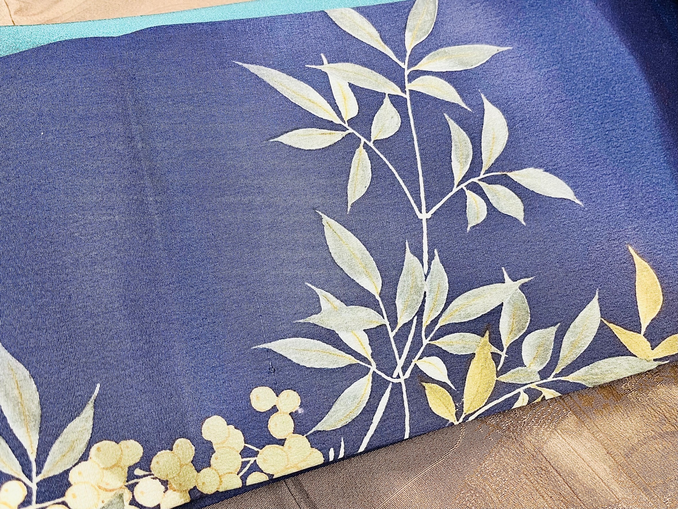 藤の木にとまる小鳥を繊細な刺繍で表現した帯に、伊予染めの小紋を合わせました。