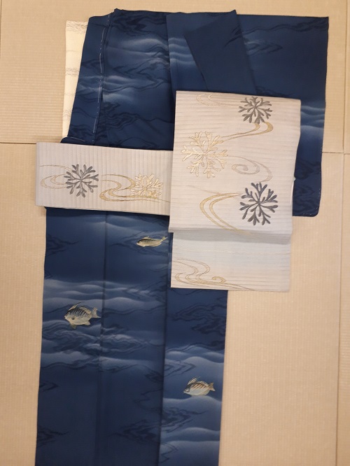 明るい藍に生成りの色が混じって、爽やかなお色になっています。