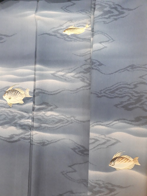 こちらの付下げは淡い灰桜の地に横段が織り出され、よく見ると織と染で薄紅や水色といった鮮やかな横線が入っており上品な中に春の陽気のような華やかさが潜んでいます。