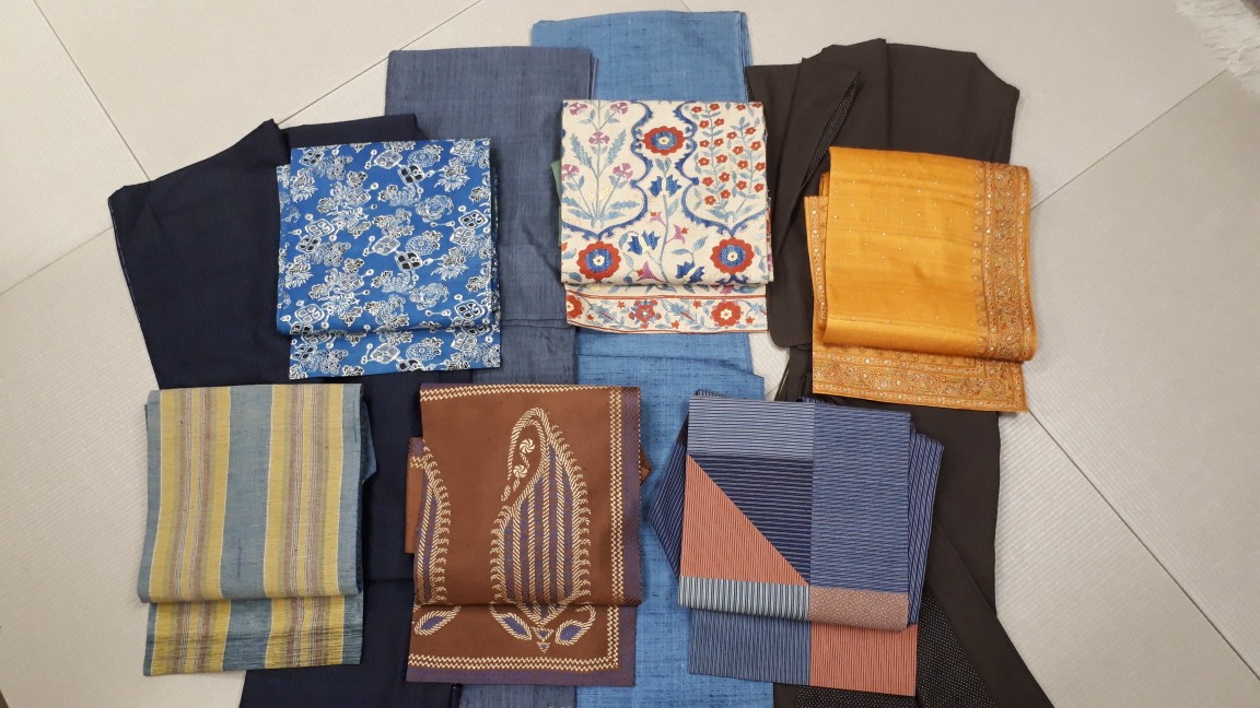 左から 藍色杢結城紬、グレー結城紬、水色藍手織紬、八掛大島茶結城紬