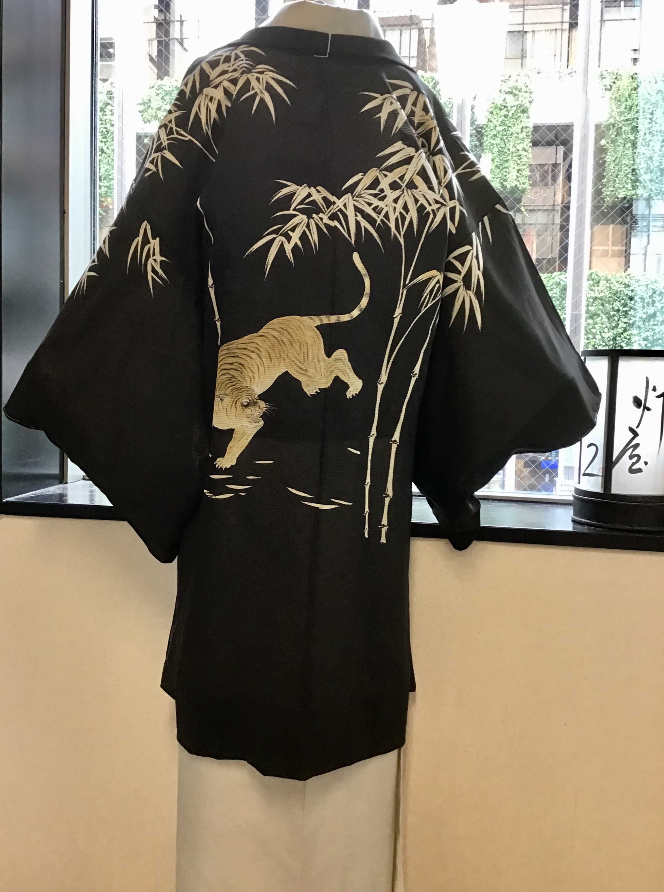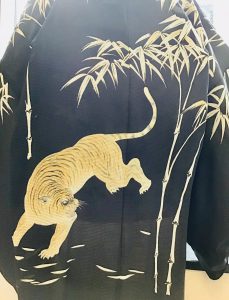 単衣の時期に着用する絽縮緬に竹林と虎が、描かれた羽織です。