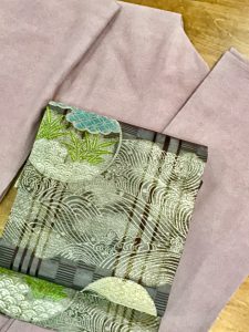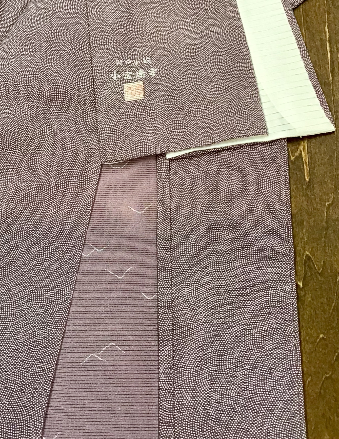 夏の江戸小紋 夏でも染めの着物の方がしっくりくる場所があったりします。 お稽古などで何枚も江戸小紋を着ますが、染めがよい江戸小紋には思わず目を奪われます。 ご紹介の江戸小紋は、小宮康孝作の鮫小紋です。 手彫りの型紙で手刷りで染められたその精密な図柄には、どことなくあたたかみがあり着てみたいと思う着物です。 紋を一つ入れて、きちんとした場面での一枚にしても良いかもしれません。 小宮康孝作江戸小紋 (着物20-6-25) 身丈:4尺2寸(約159.6㎝) 裄:1尺7寸2分(約65.3㎝) 波に丸文様紋絽名古屋帯