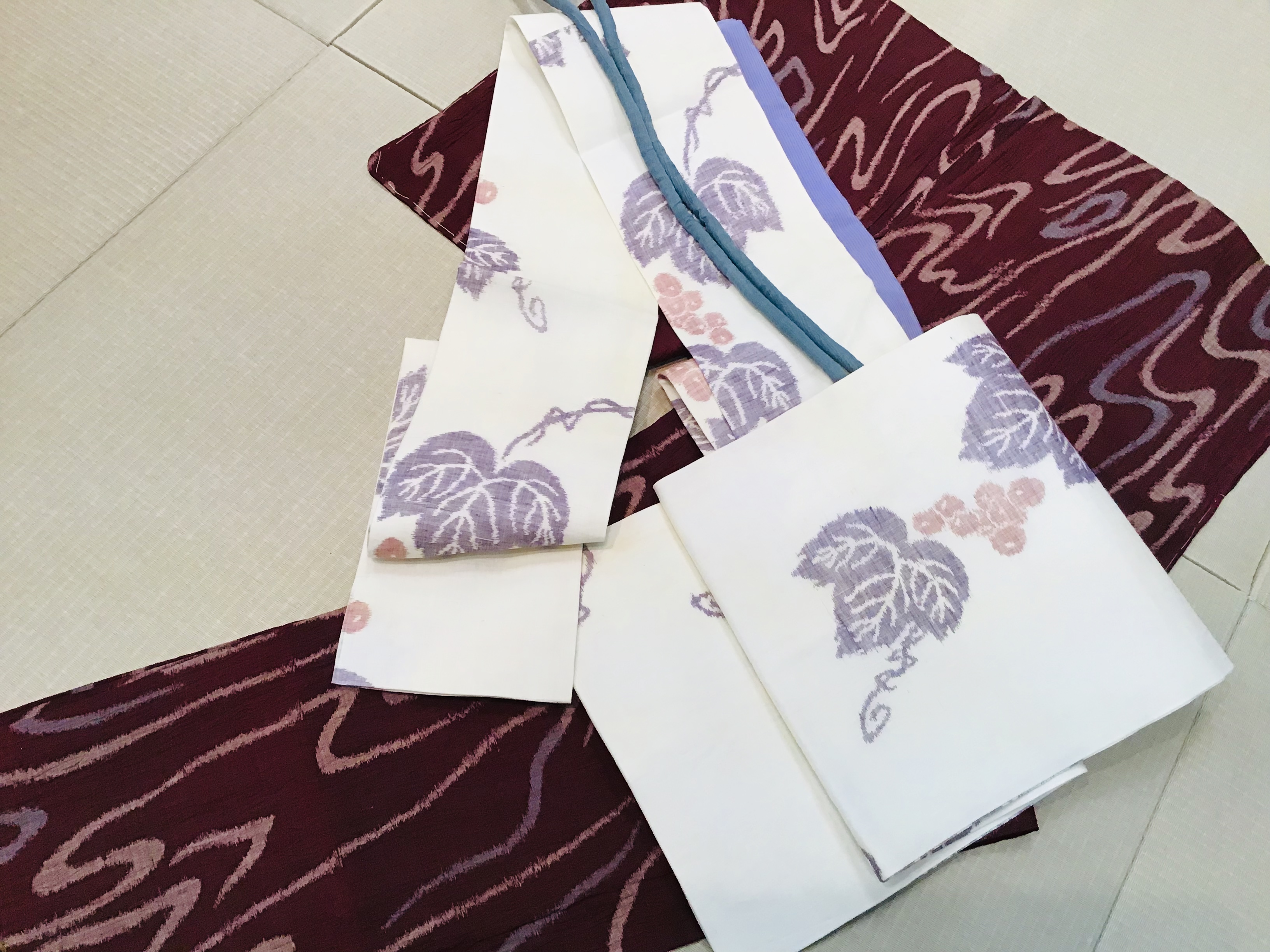 ぶどう色の小千谷縮 深いワインのような色。 ならば、帯はこれでいきましょう🍇 たまにはお気に入りの着物でちょっとほろ酔い気分はいかがでしょうか。🍷 ぶどう色の小千谷縮 75,000円+税 身丈4尺2寸(約159,1㎝) 裄1尺8寸(約68,1㎝) 麻地ぶどう名古屋帯 25,000円+税 麻丸ぐけ 6,500円 絽帯揚げ 6,500円