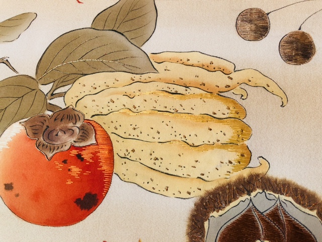 帯の中央に描かれている珍しい実は、仏手柑(ぶっしゅかん)という蜜柑の仲間です。