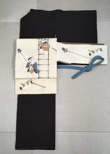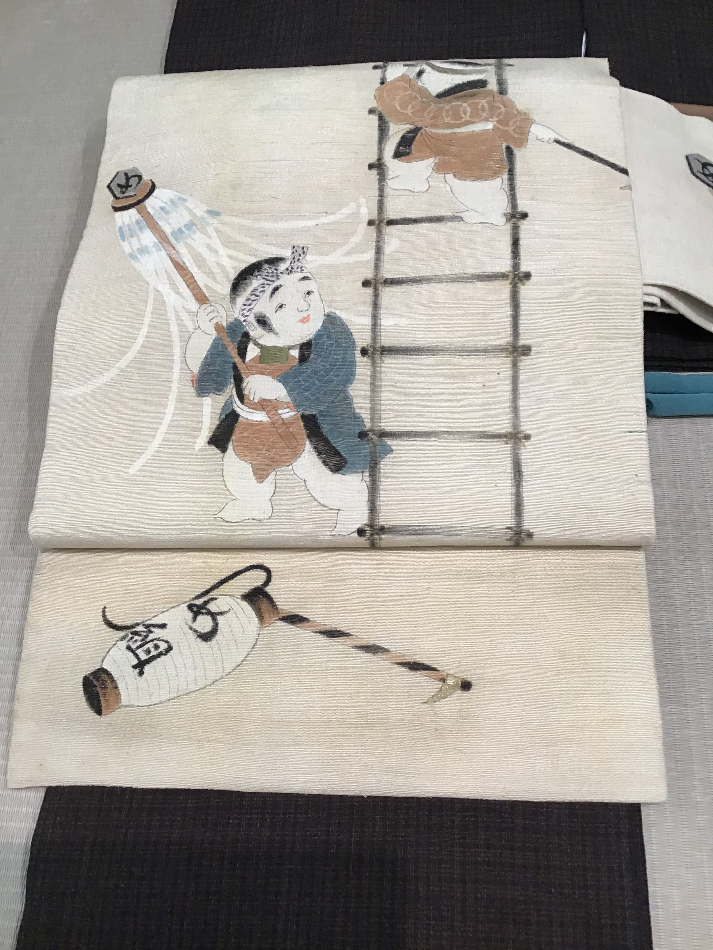 可愛らしい出初式 ヤァっと掛け声が聞こえてきそうな、可愛い可愛い出初式の名古屋帯です。 むっちりした手足で一生懸命です。 今はまだまだ甘えん坊なめ組ですが、将来は江戸の花になるかもしれませんね。 鉢巻や火消し半纏にさりげなく刺繍が施されています。 本場結城紬 140000円+税 身丈4尺(152cm)、裄1尺7寸(64.6cm) め組の出初式名古屋帯 30000円+税