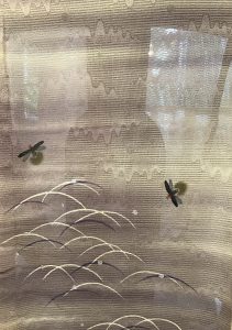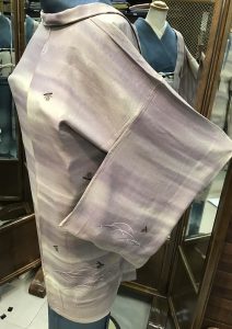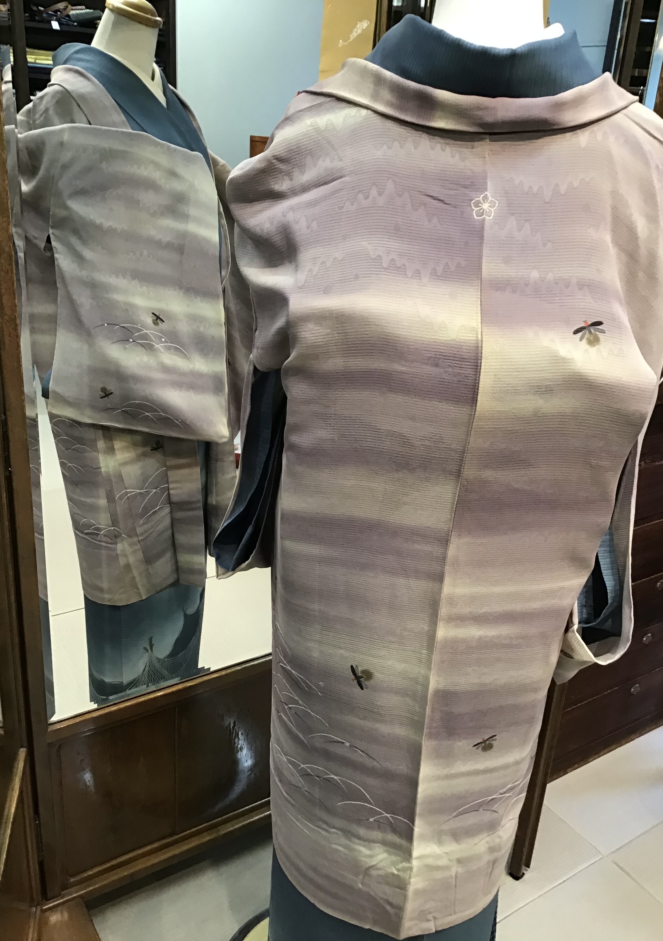 絽縮緬の羽織 美しい絽縮緬の羽織が新入荷しました。 細かな地紋は壺垂れと水玉。 灰色がかった紫が、全体的に暈しになって染められています。 更にそこに飛び交う蛍と露芝の風情。 もはや失われてしまった幽玄、アンティークならではの儚くも美しい世界。 どんな世の中であっても私達が忘れてはいけない「もののあはれ」を思い出させてくれる羽織です。 蛍の絽縮緬羽織 裄 1尺6寸6分 (約62,8㎝) 残念ながらこれ以上出ません。 身丈 2尺5寸 (約95,7㎝)