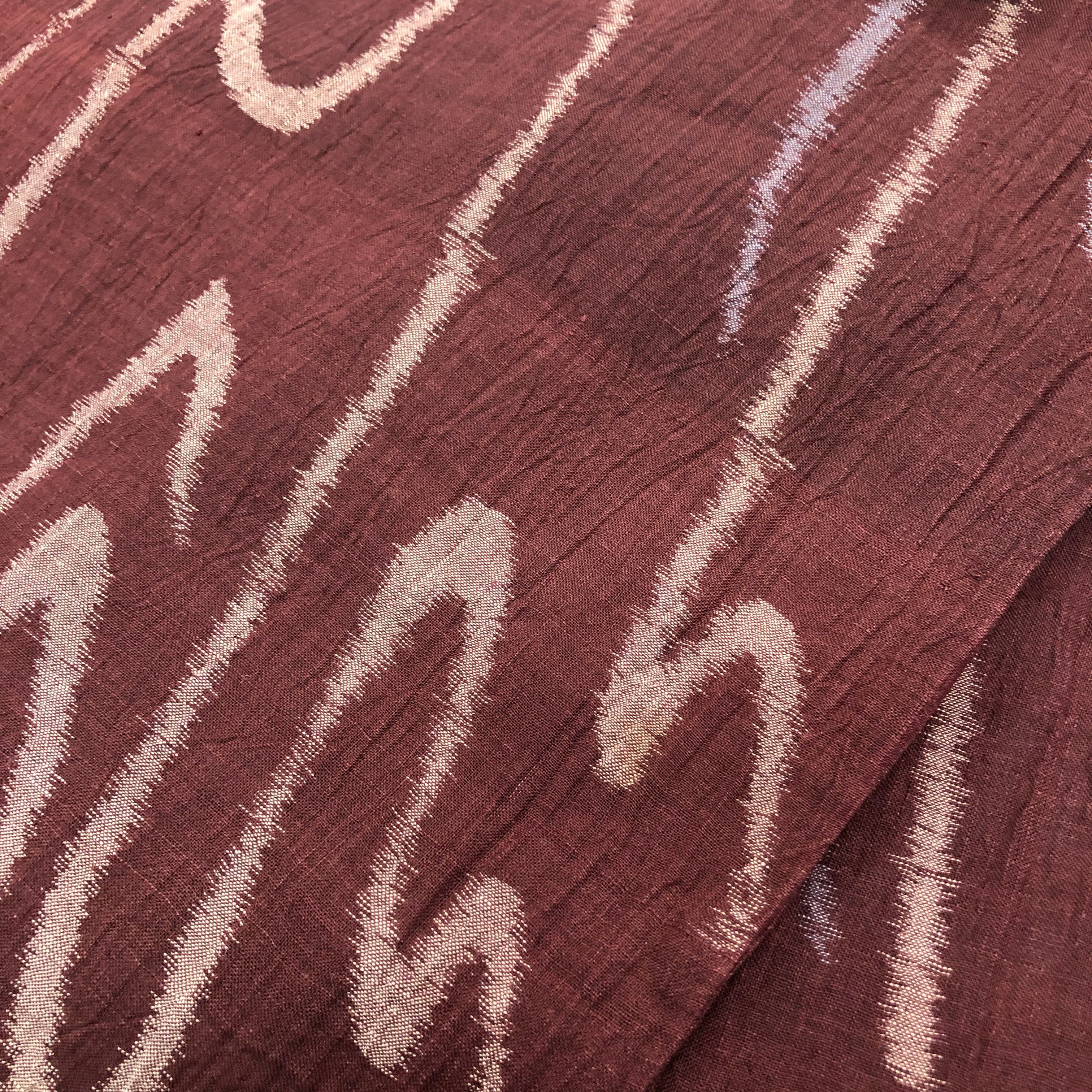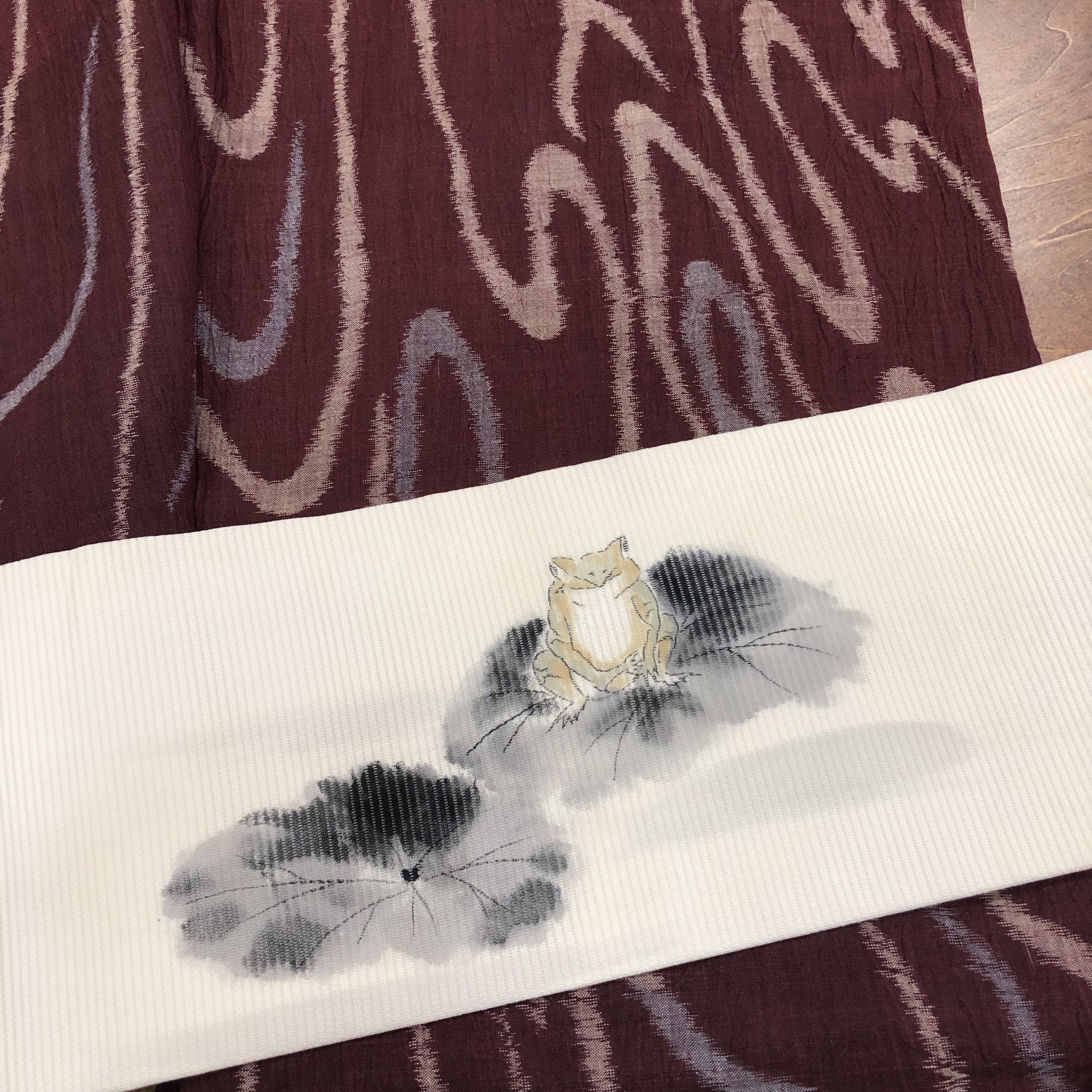 素敵色の小千谷縮 とても珍しい素敵な色の小千谷縮のご紹介です。 明るい小豆色にのびのびとした水色とサーモンピンクの流水模様。 今ではなかなか見ることの出来ない大胆なデザインの小千谷縮です。 合せてみたのは今の季節ならではの絽のカエルの染帯。 シンプルな色使いに何とも言えない愛らしい顔ですね! 夏に向けて大胆にかつ爽やかなにお召し下さい! 小豆色に水色とサーモンピンクの小千谷縮 裄1尺8寸(68.4cm)身丈4尺2寸(159.6cm)82,500円税込
