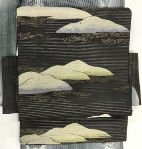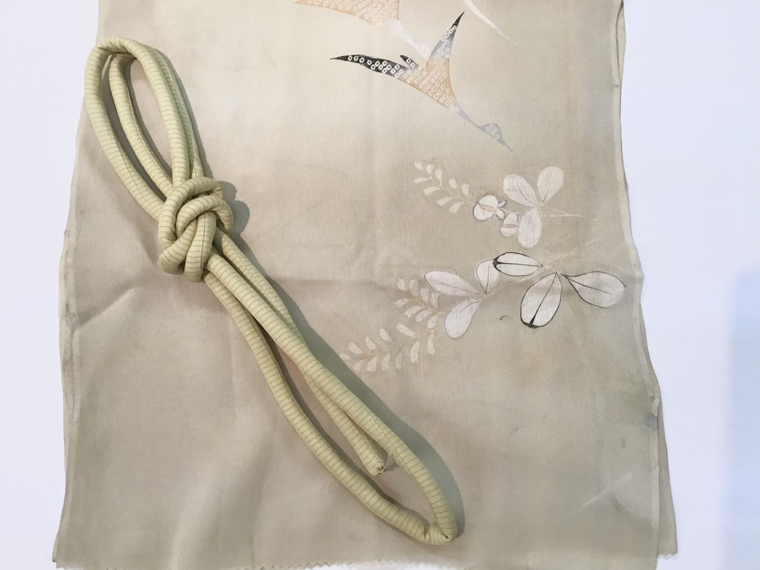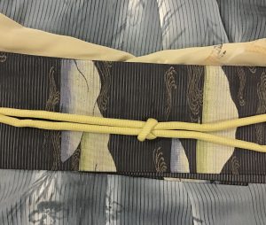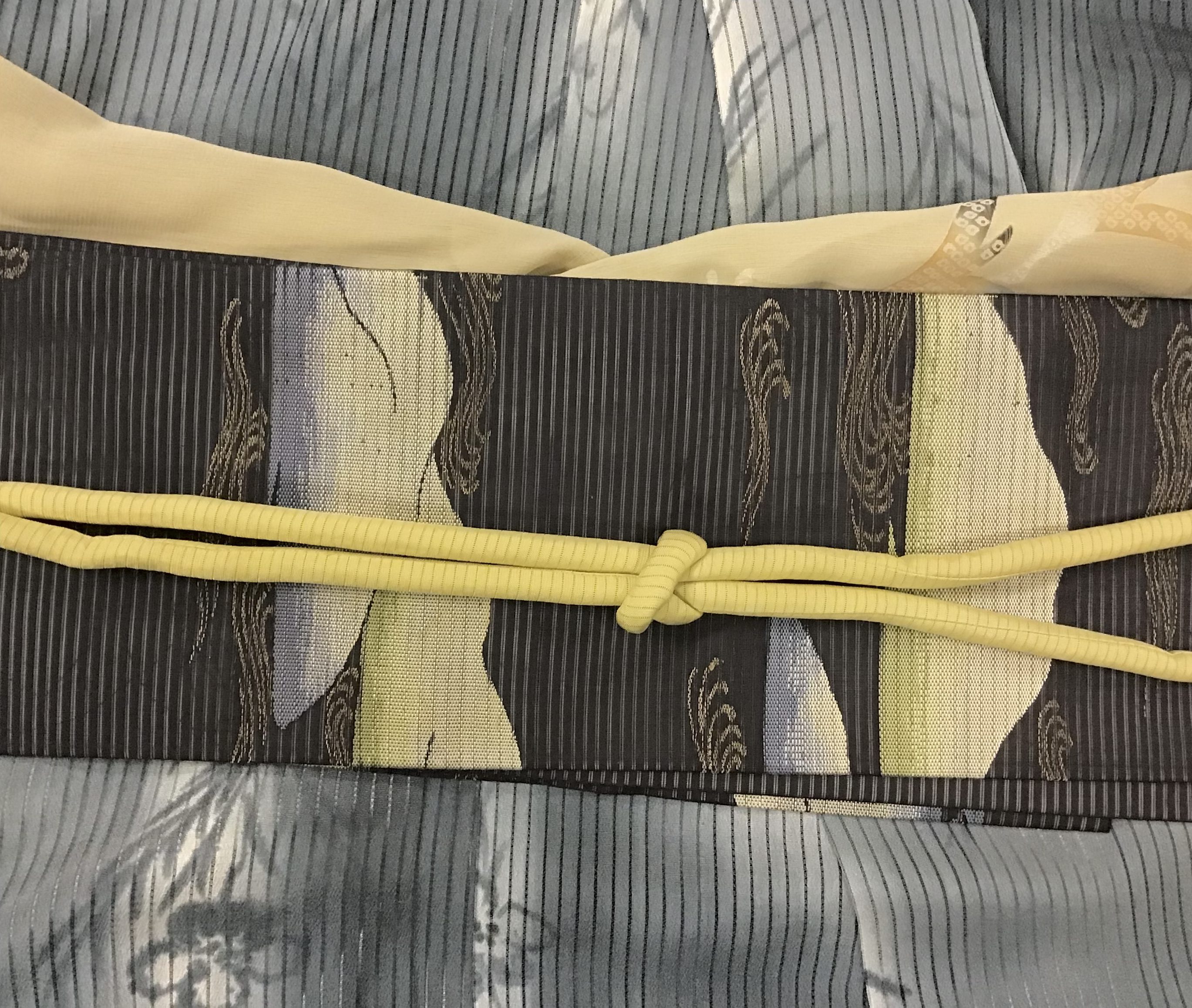 帯揚げは錦紗のべージュで柄があるもの、丸ぐけは、絽でベージュがかった黄色にしました。
