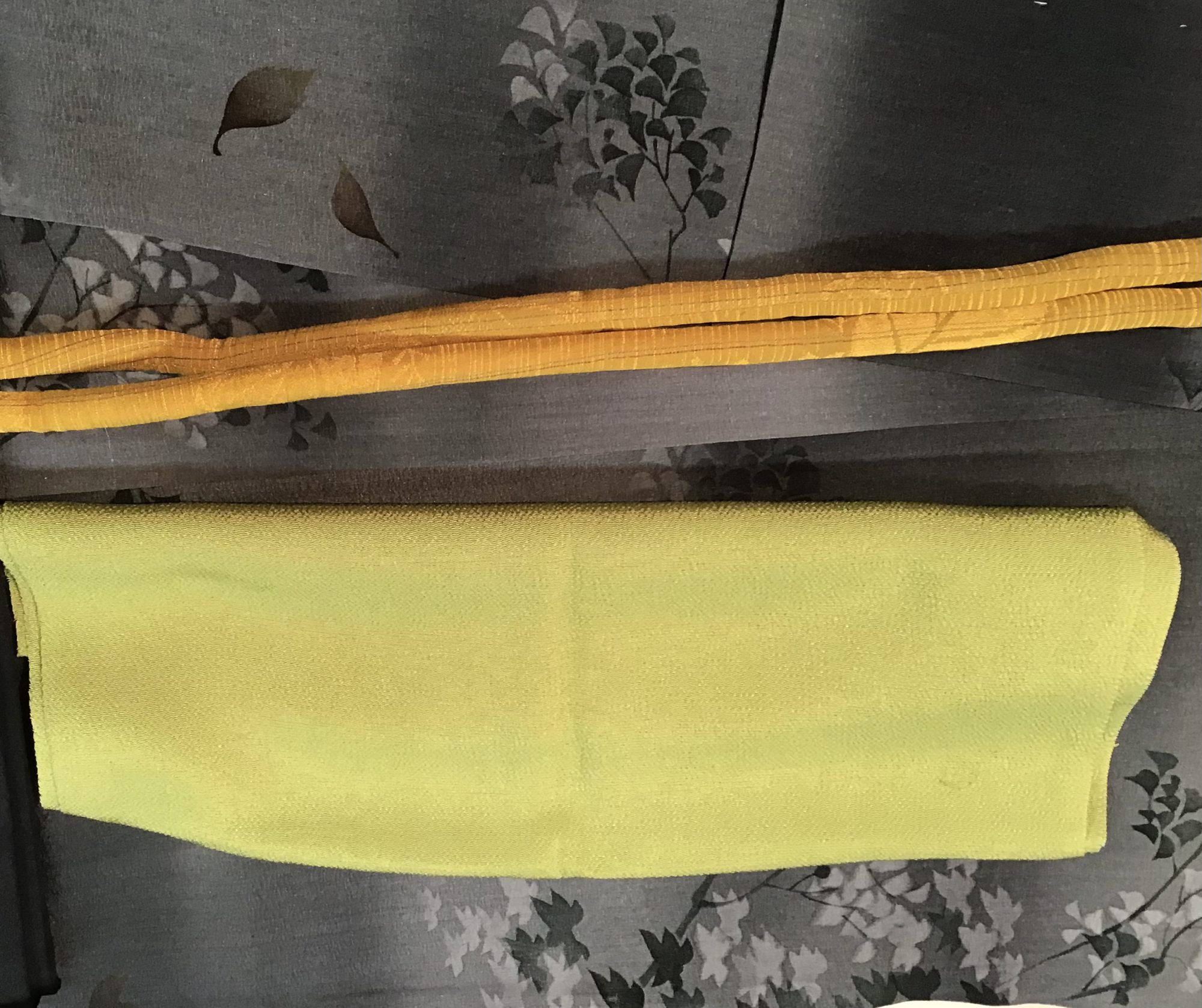 丸ぐけは、地模様のある辛子色~山吹色で、色のニュアンスが複雑で、とても使いやすい色です。帯揚げは、明るめの抹茶色です。