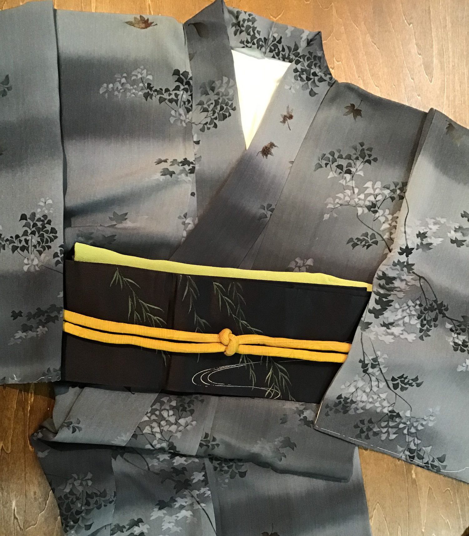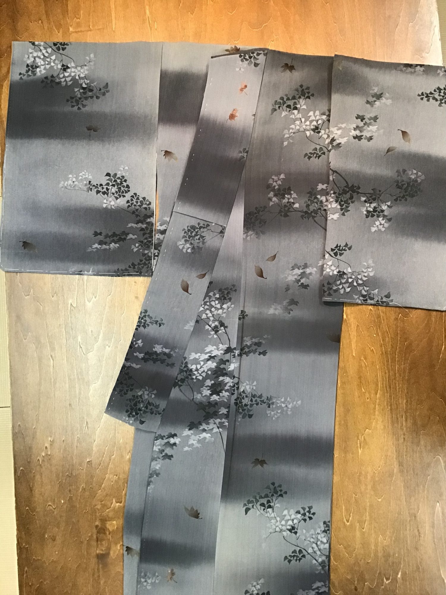 こちらは、墨色引き染めのぼかしがとてもシックな付下げです。そこに、赤茶色の紅葉や木の葉が散っていて、襟元など、刺繍あしらいがされています。