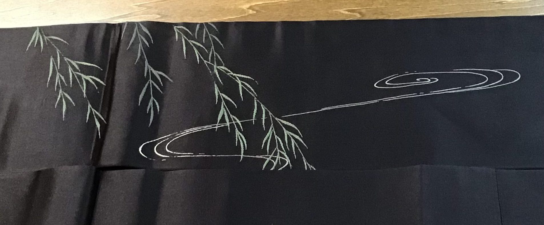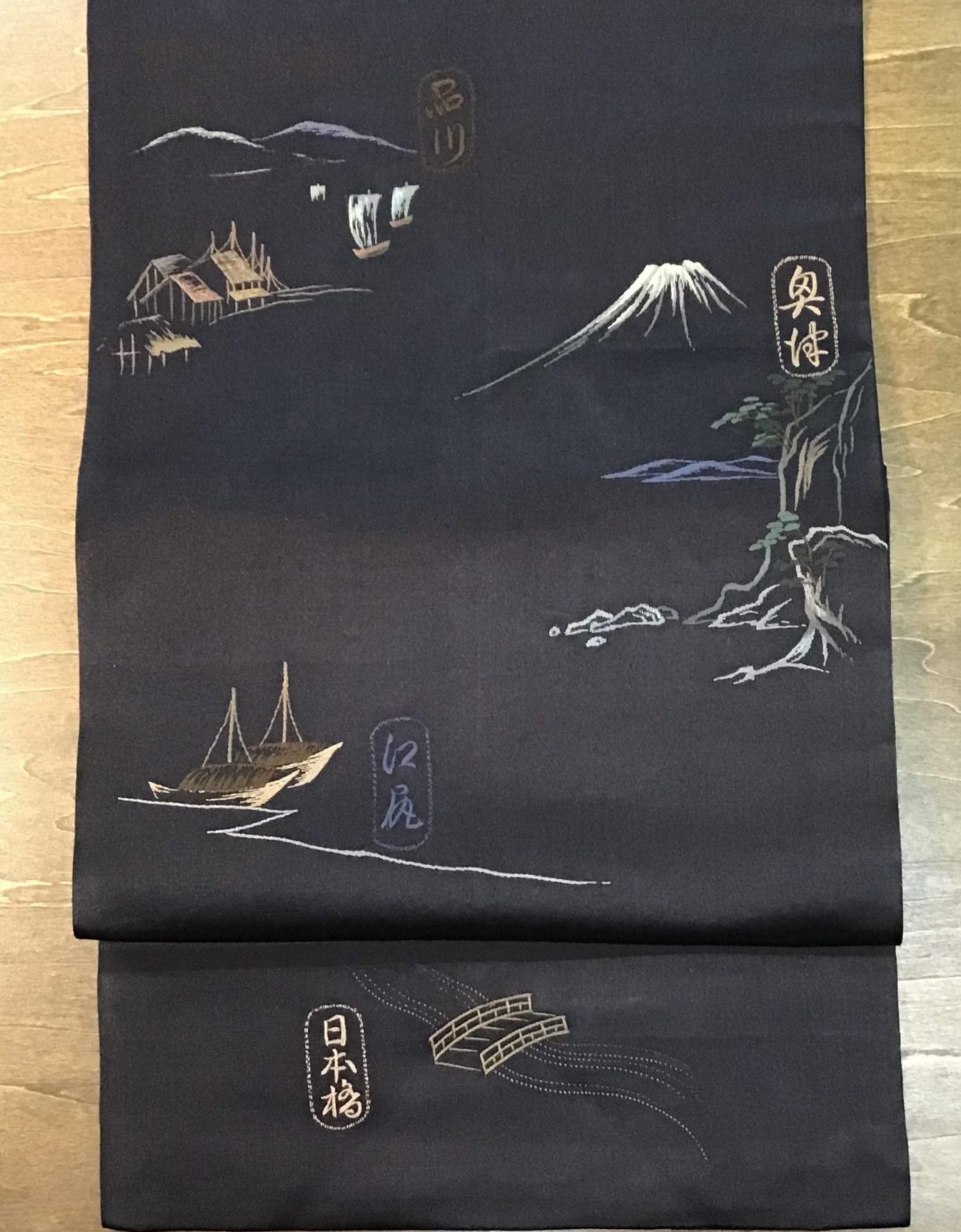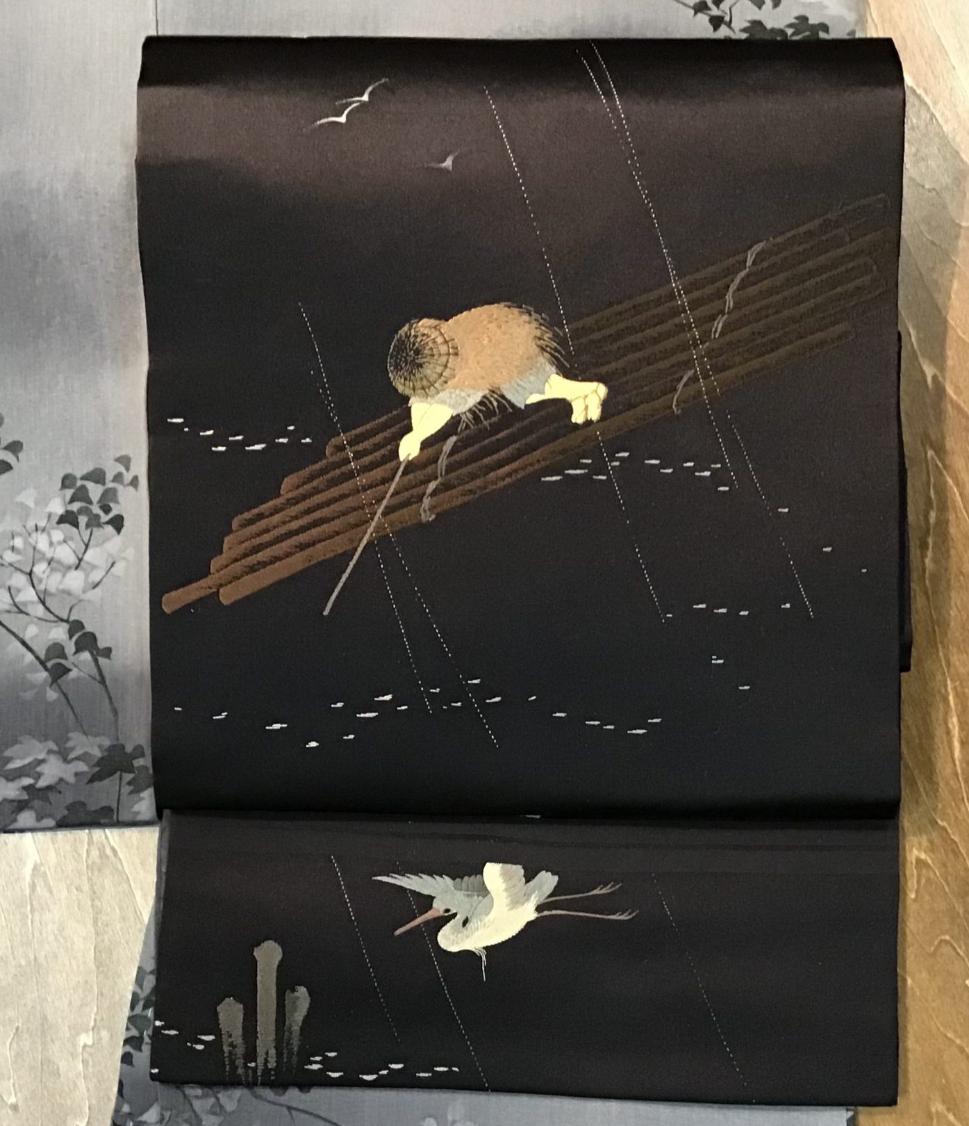 帯地は黒繻子で、筏の川下りと水辺の景色が刺繍されています。水の音、風の音が聞こえてくるようですね。