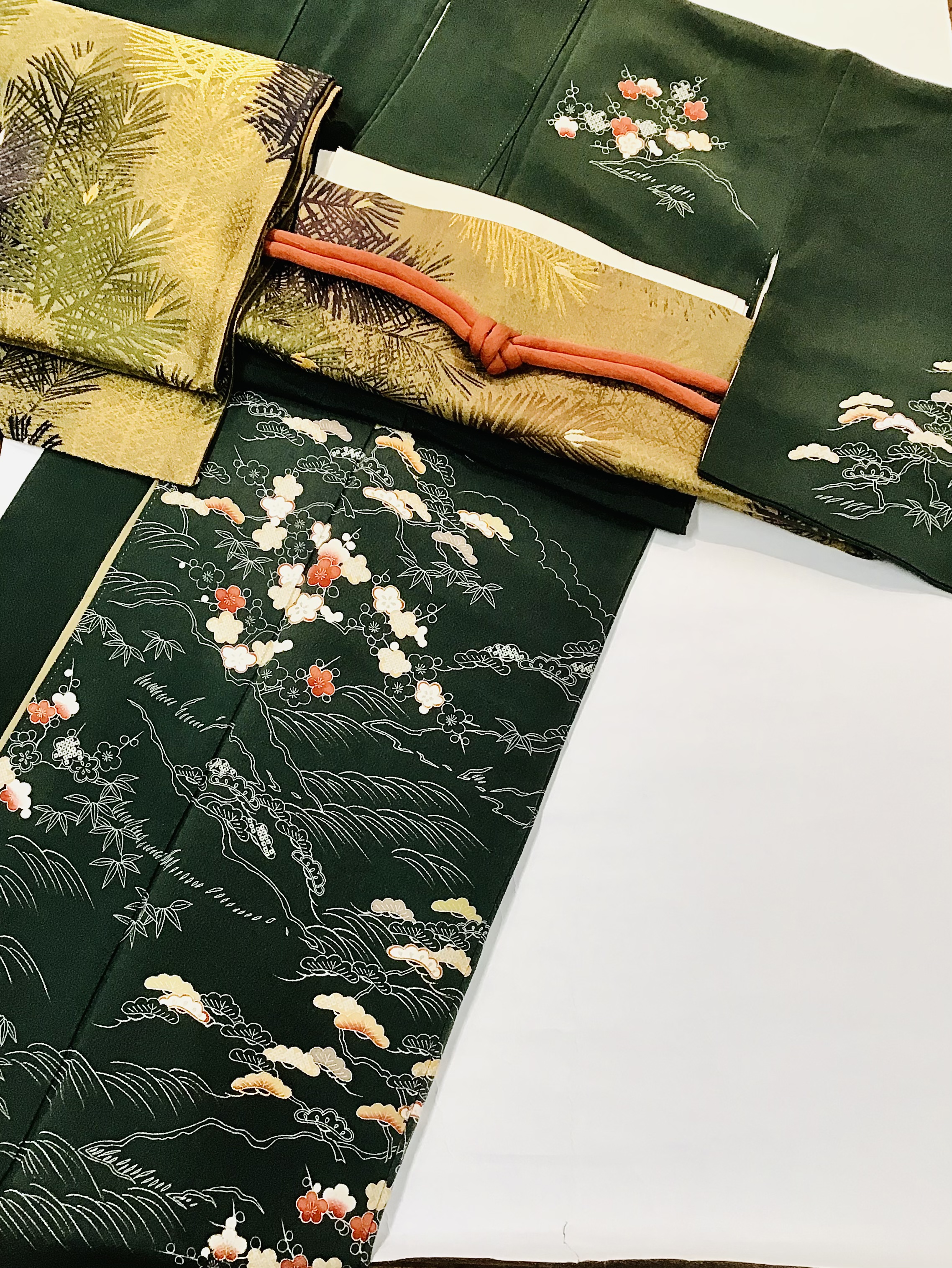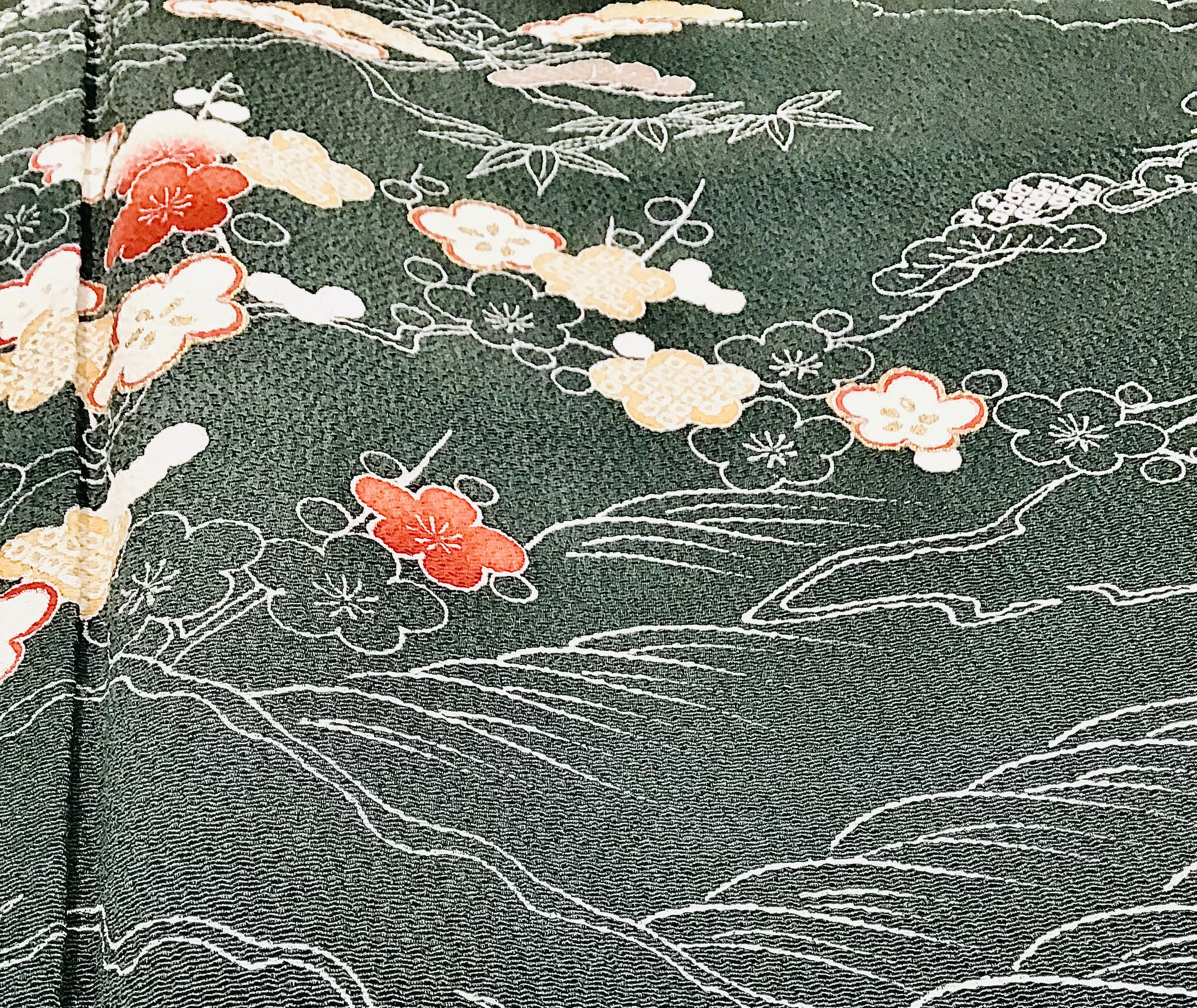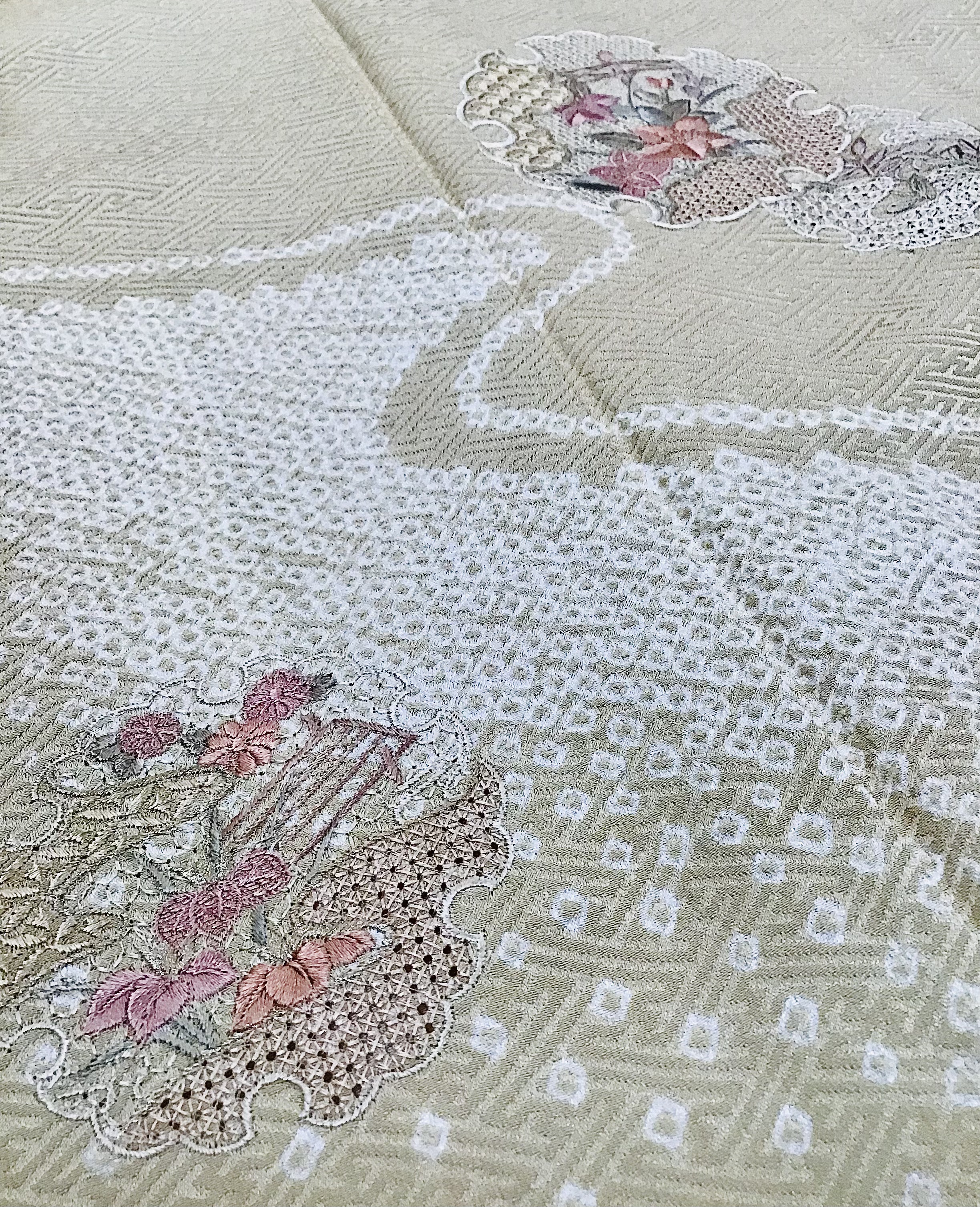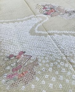 最初にご紹介の着物は、縮緬地に糸目友禅で御所解文様が描かれた訪問着です。