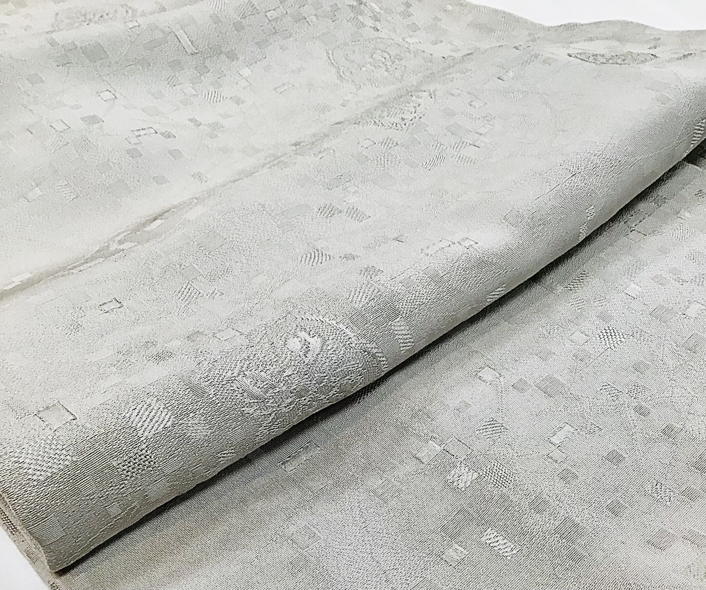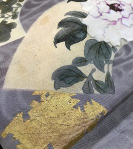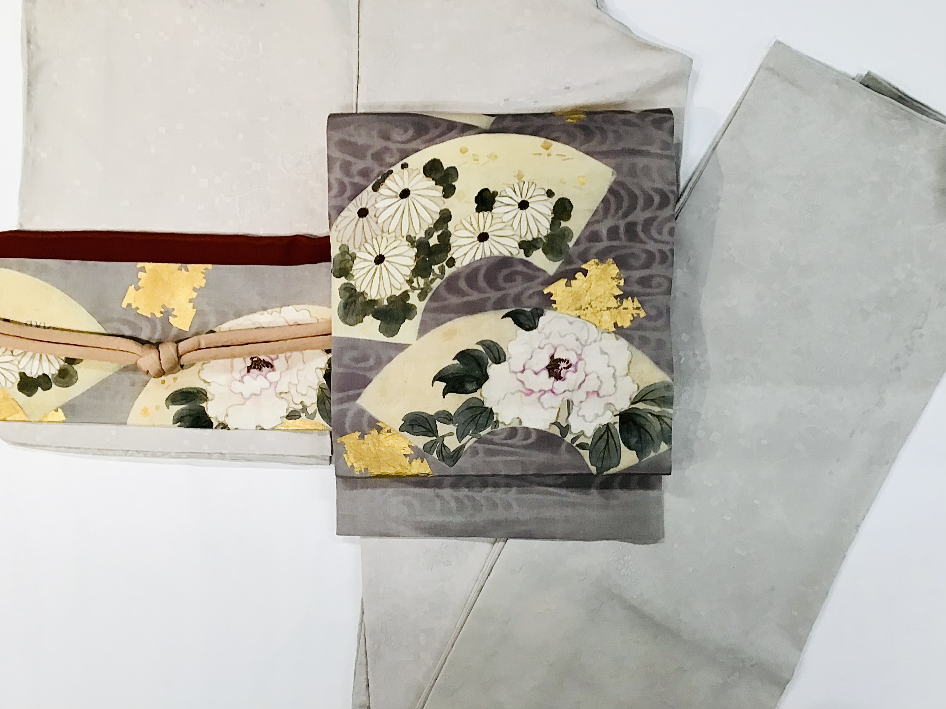 合わせた帯は、帯地に観世水が描かれた上に、扇面の中に四季の花が手描きされた名古屋帯です。