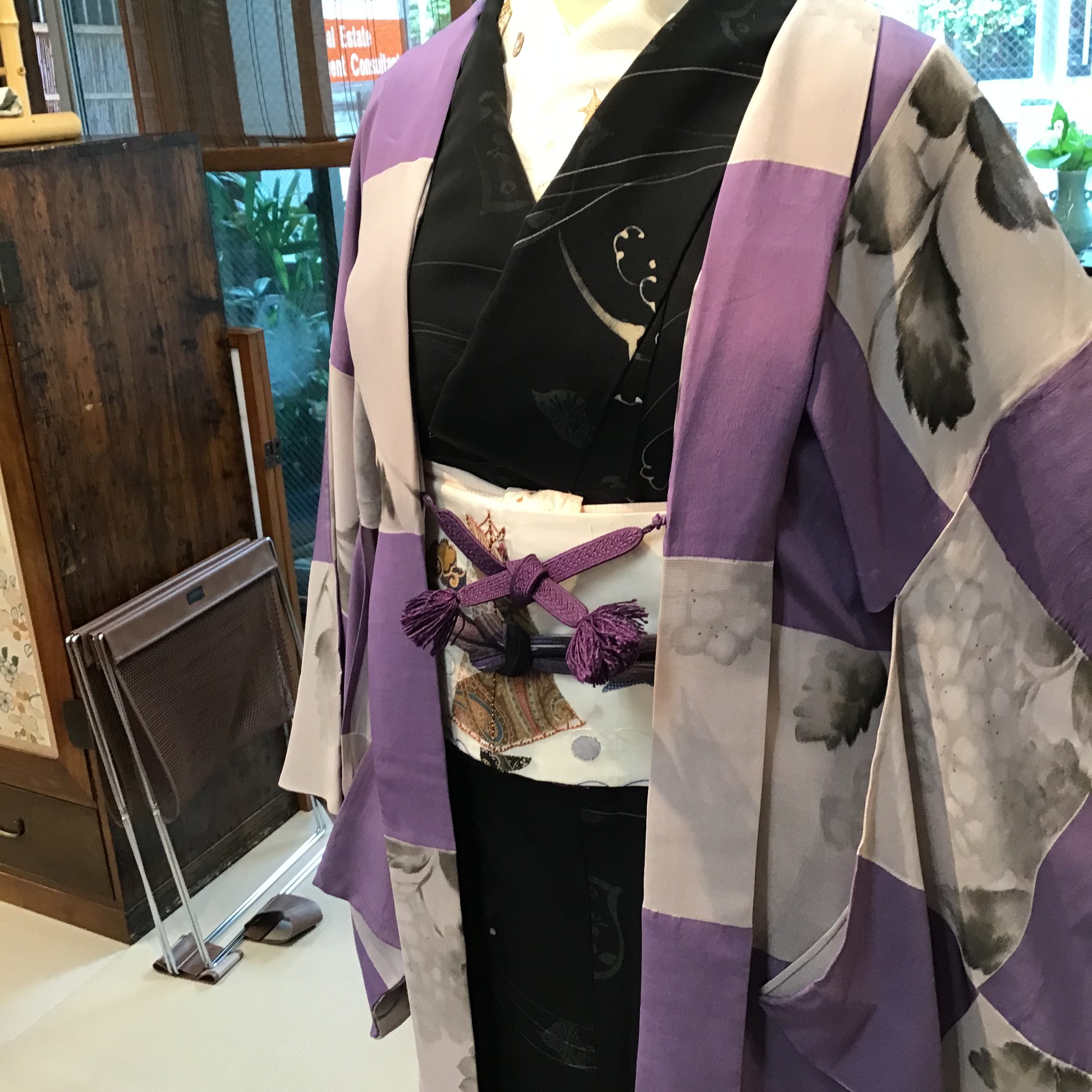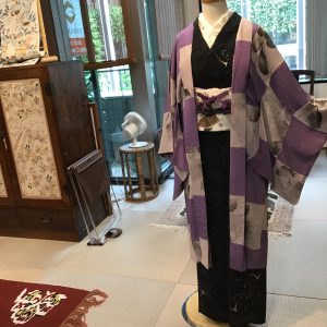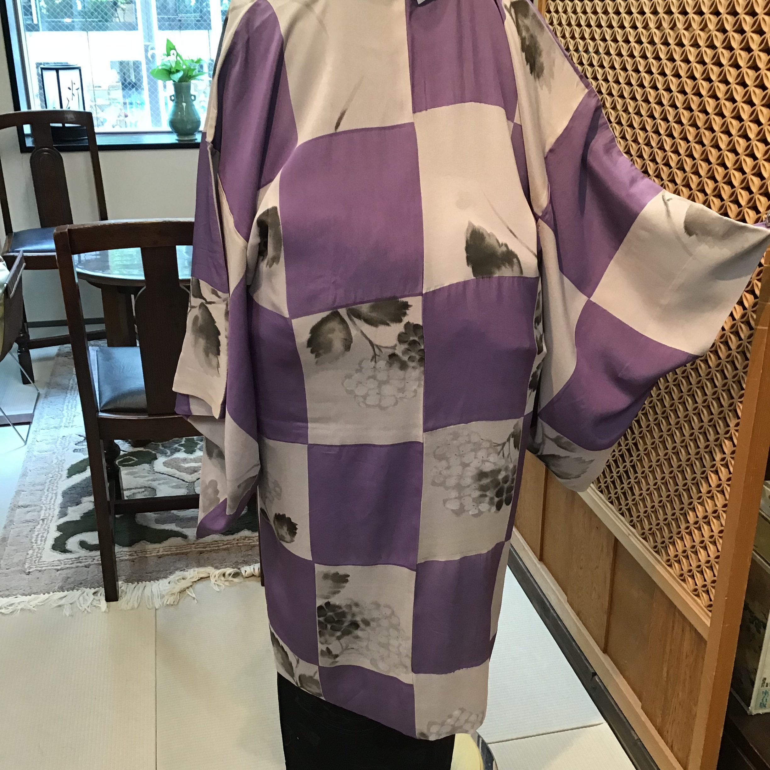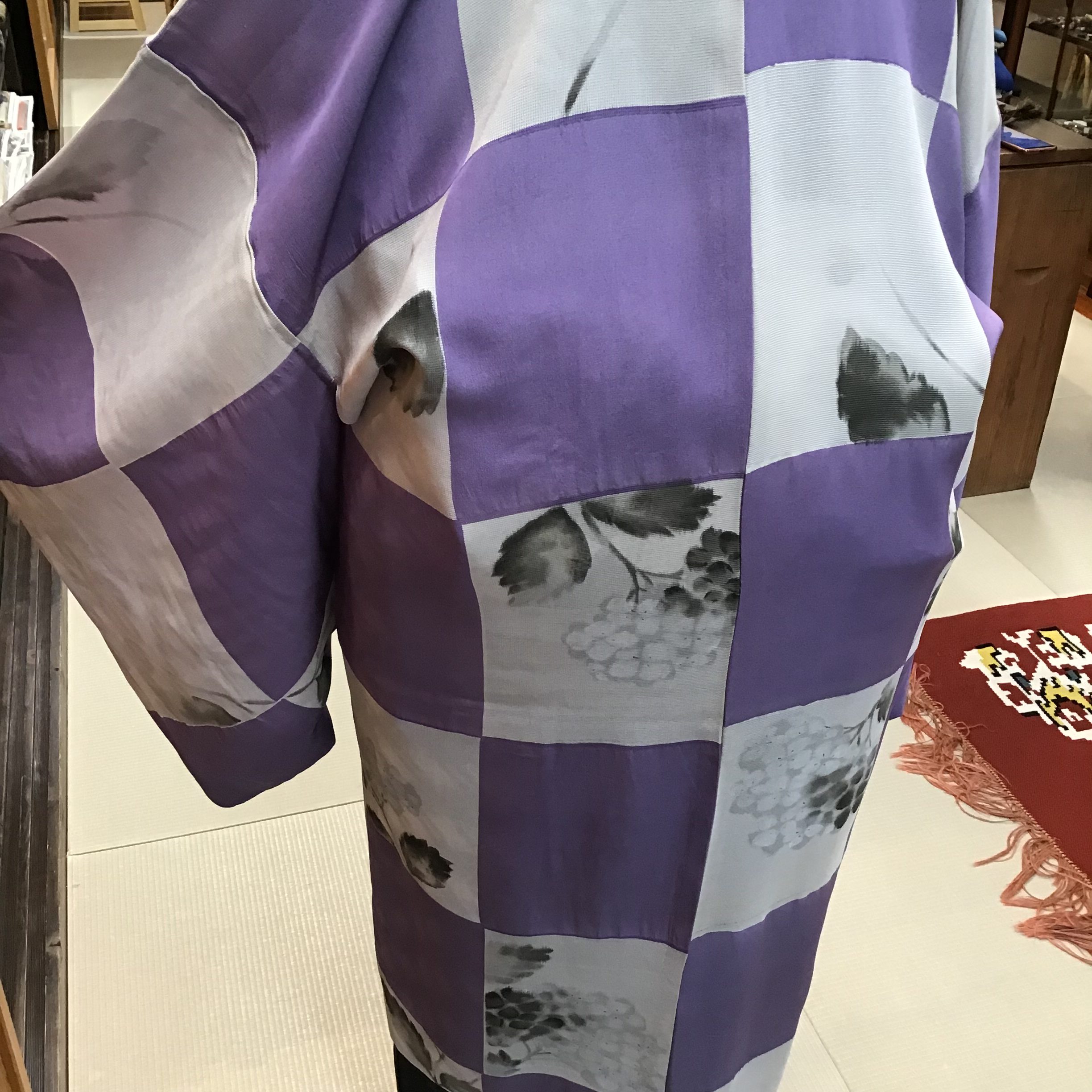 大胆ですが優しい紫色の大きな市松模様に薄墨色で描かれた紫陽花は実はさり気ない様子。