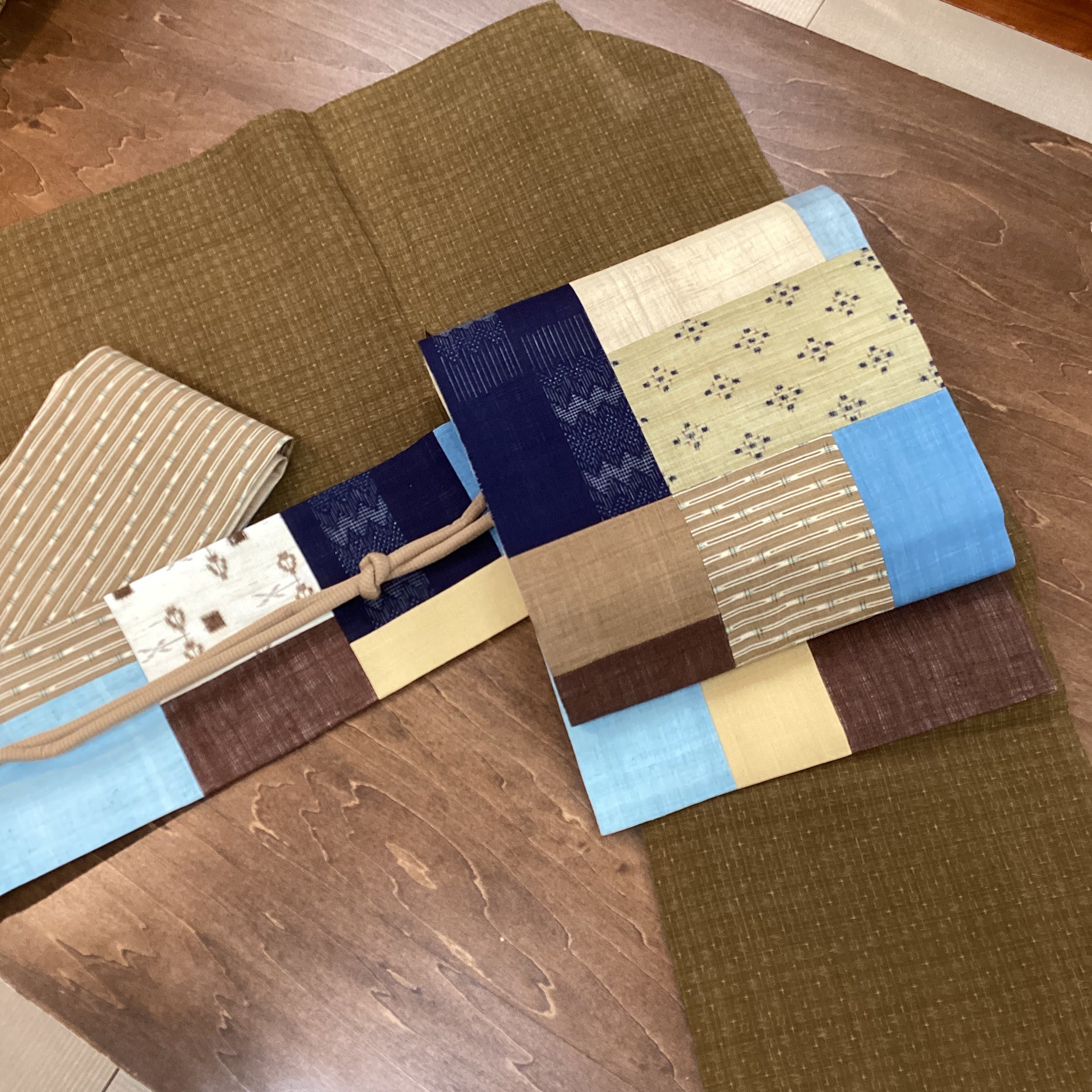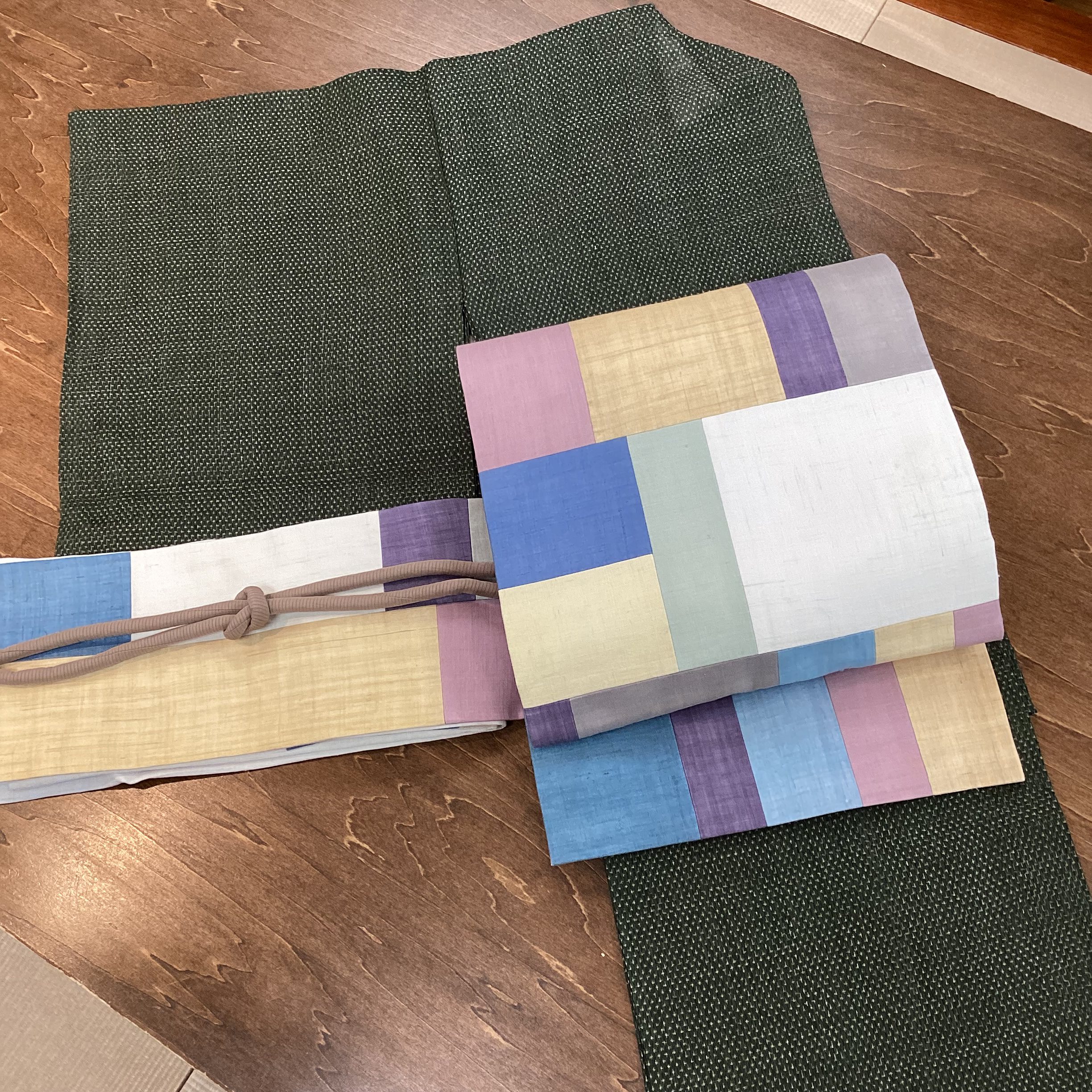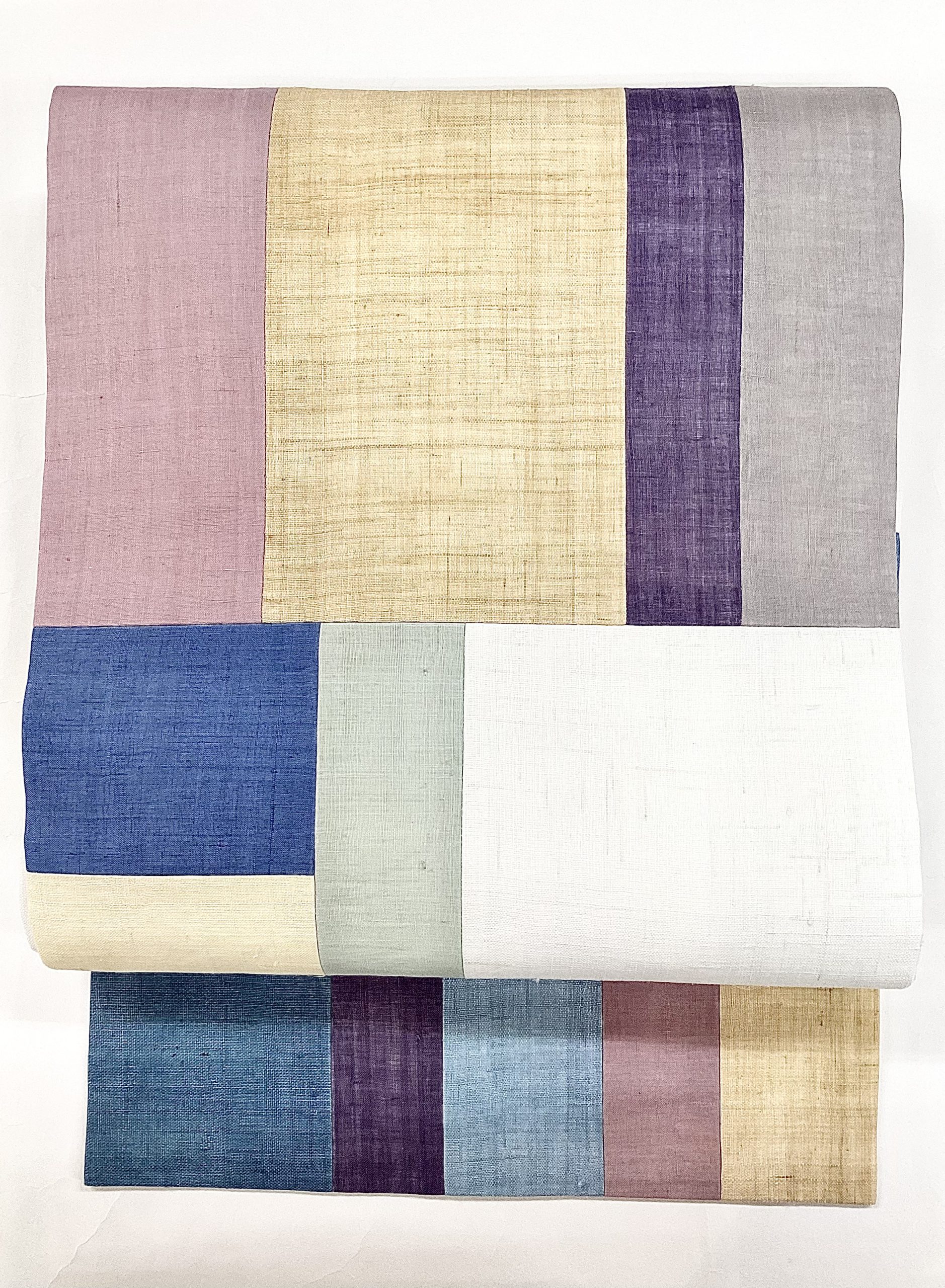 こちらにはややスモーキーなパステルカラーのポジャギ風継ぎ帯を合わせてみましたがいかがでしょうか。やはり貴重な麻の数々。