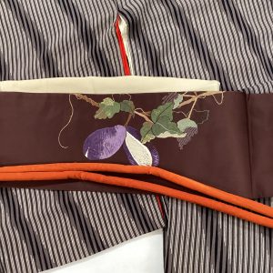 繻子調の地にアケビの刺繍の帯を合わせてみました。アケビといっても最近はなかなか本物にはお目にかかれませんがこちらの帯でいかがでしょうか?