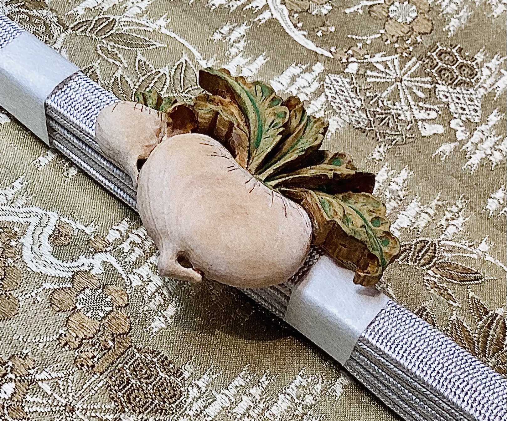 木彫りのカブラ みずみずしいカブラが新鮮な帯留めです。 16500円