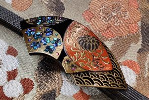 鼈甲に蒔絵螺鈿を施した豪華な名入り帯留め 扇形に菊に梅、青海波のおめでたづくし 16500円
