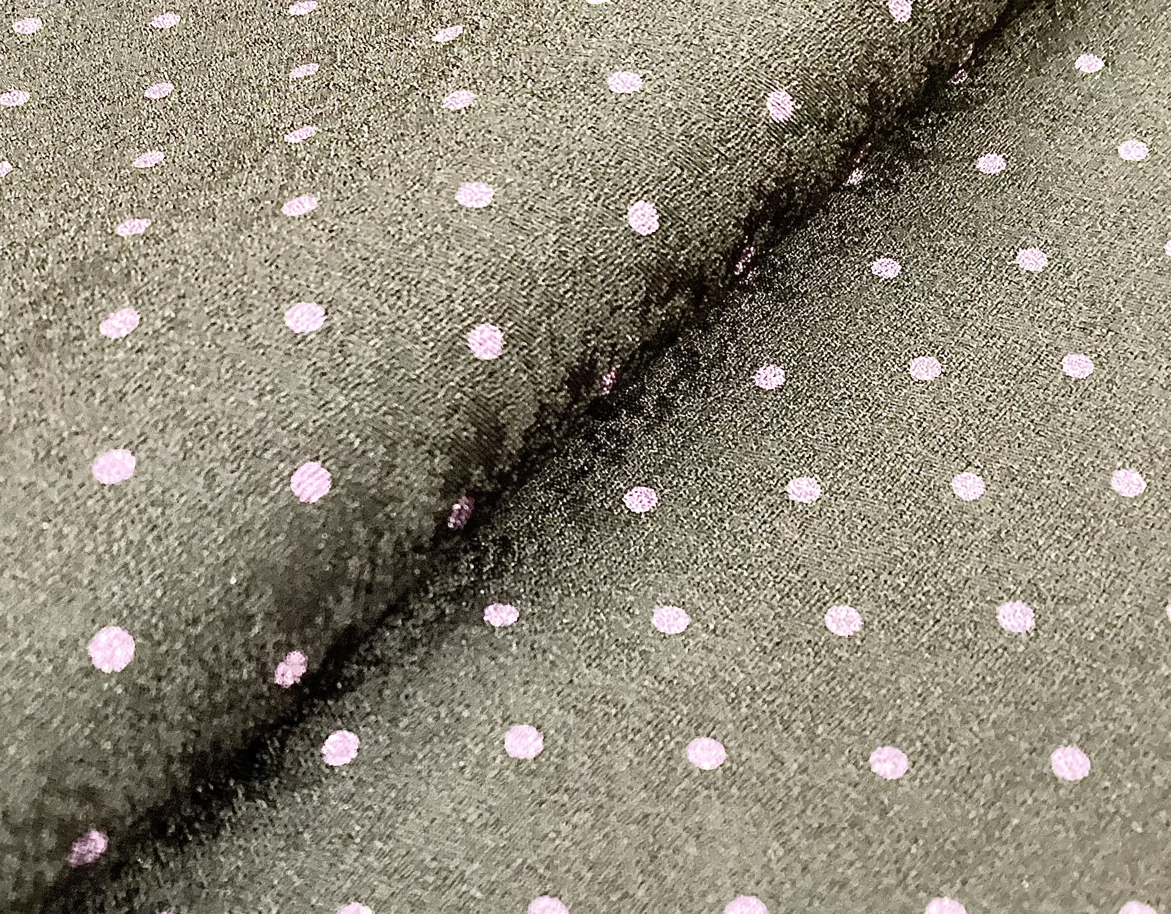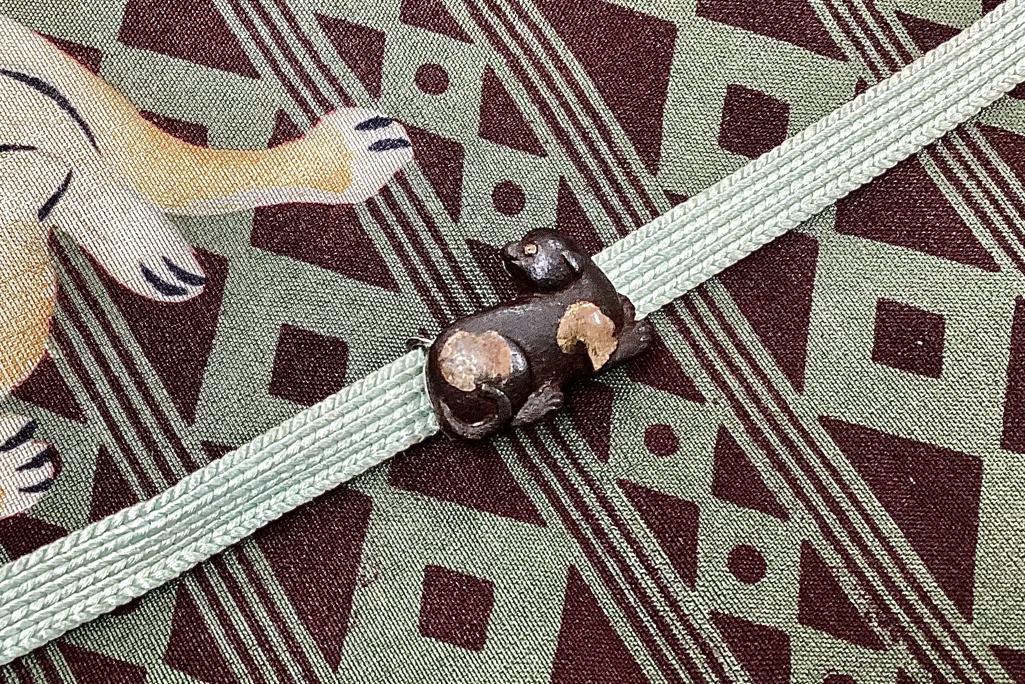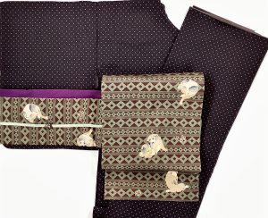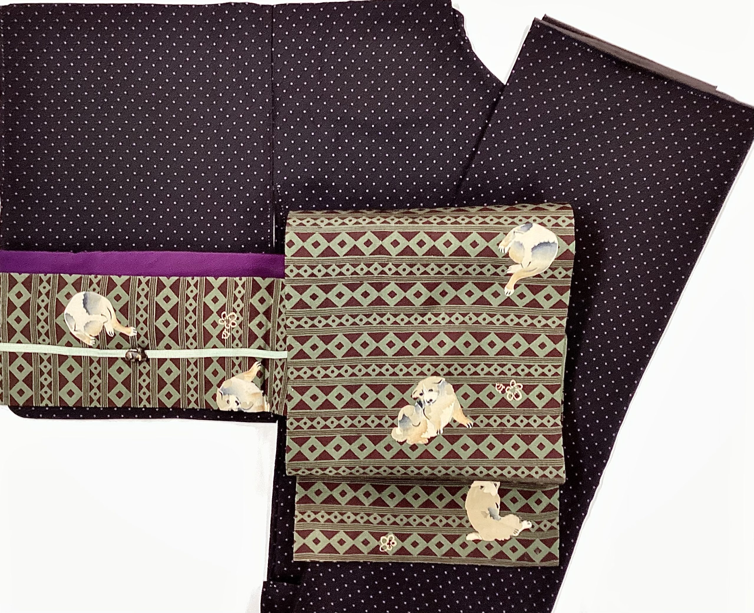 年末のお買物に気軽な装いで 2022年も間もなく終わり、締めくくりの気忙しい頃、クリスマスや新年に向けたお買い物に、味も心も軽くお出掛けいただける、取り合わせ。 黒地に小さな紫の水玉、粋で可愛いオシャレ小紋 55,000円 身丈4尺2寸 裄1尺7寸5分 黒地に緑、犬のかわいいしぐさを描いた染め名古屋帯 横座りの犬 金工の帯留め
