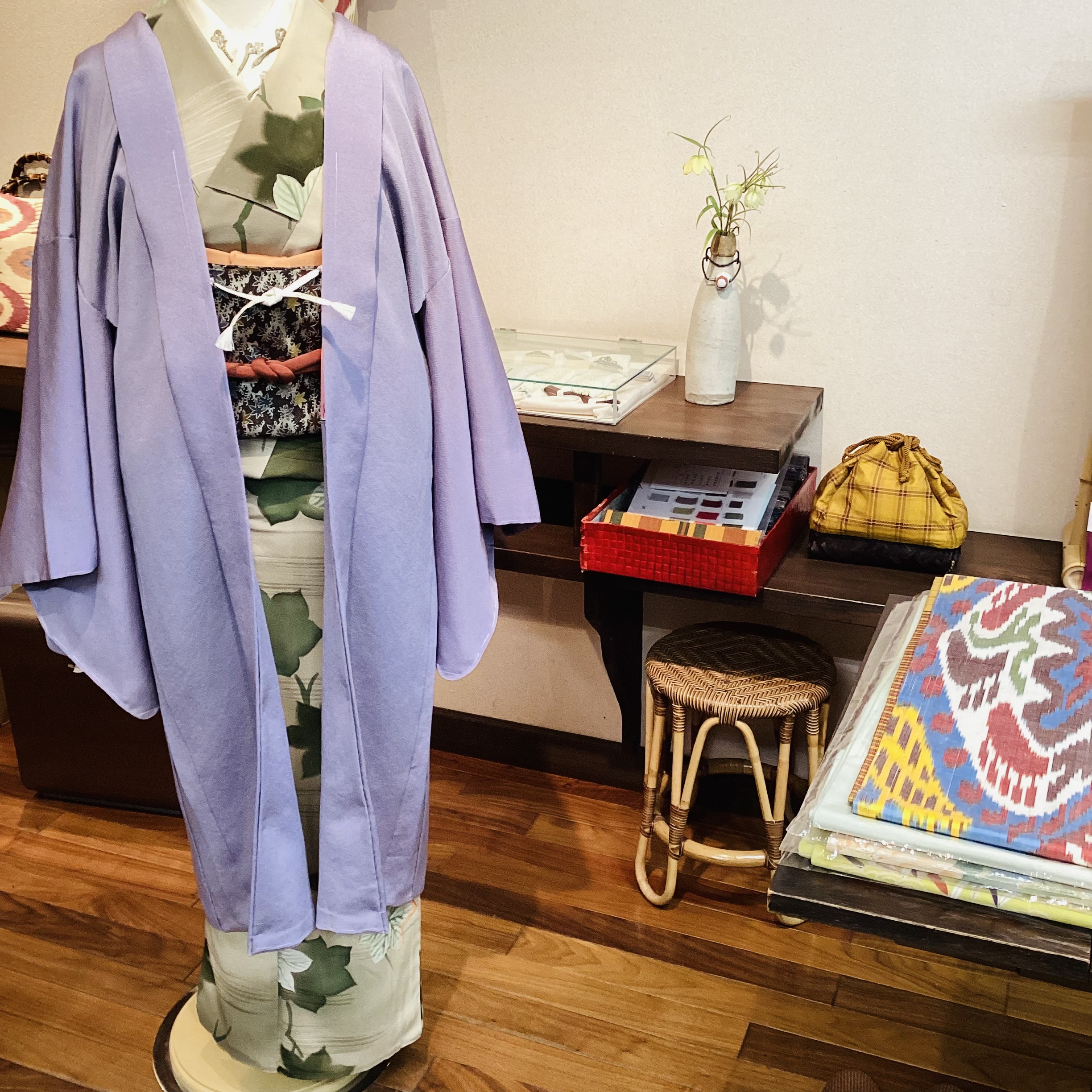 優しい藤色の色無地の縮緬の羽織。こちらは裄が約70cmと裄が長い方に朗報ですよ。