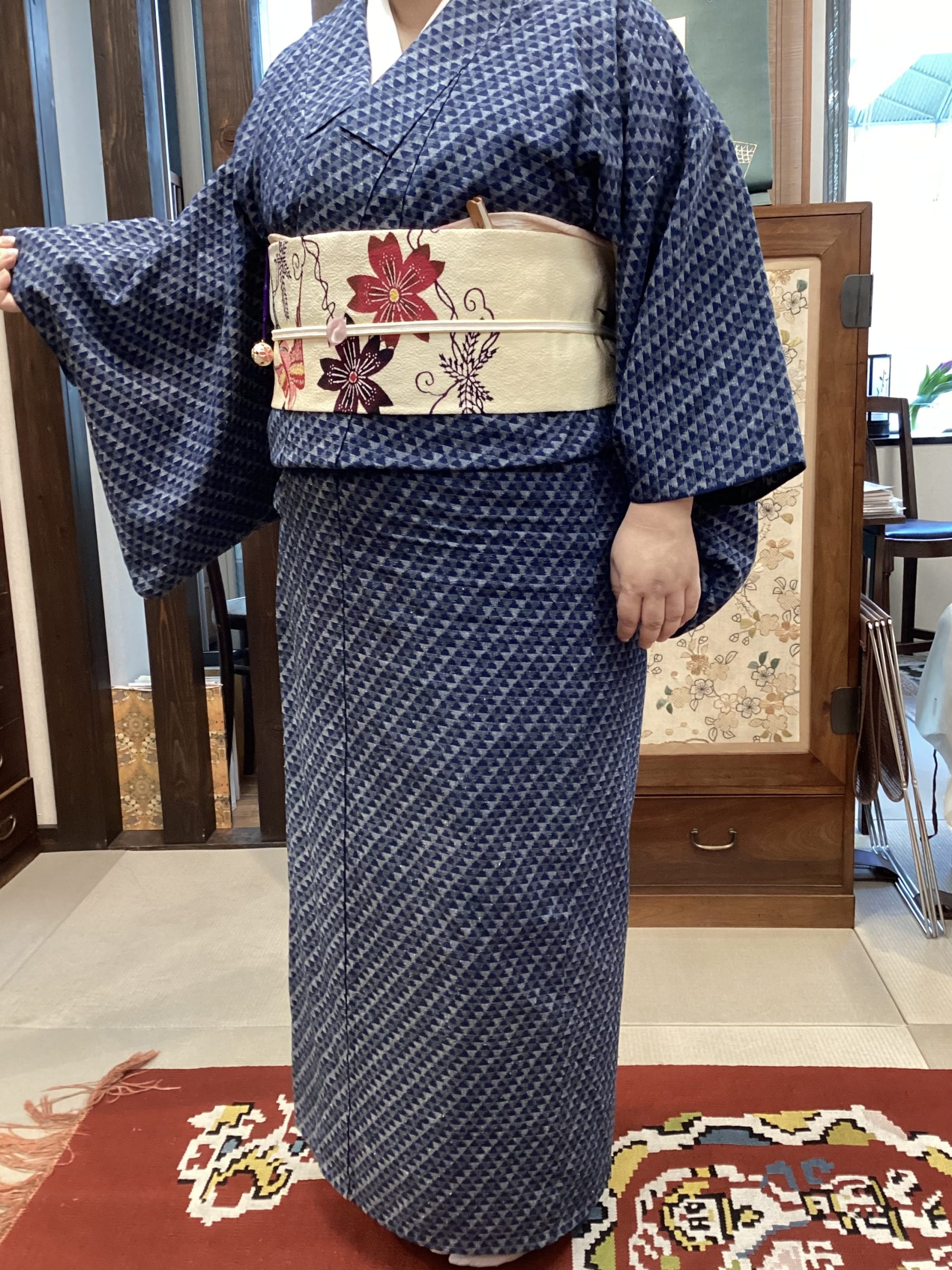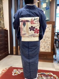 続いてご紹介のお客様は、久留米絣のお着物に浦野理一の紅型の帯でご来店いただきました。