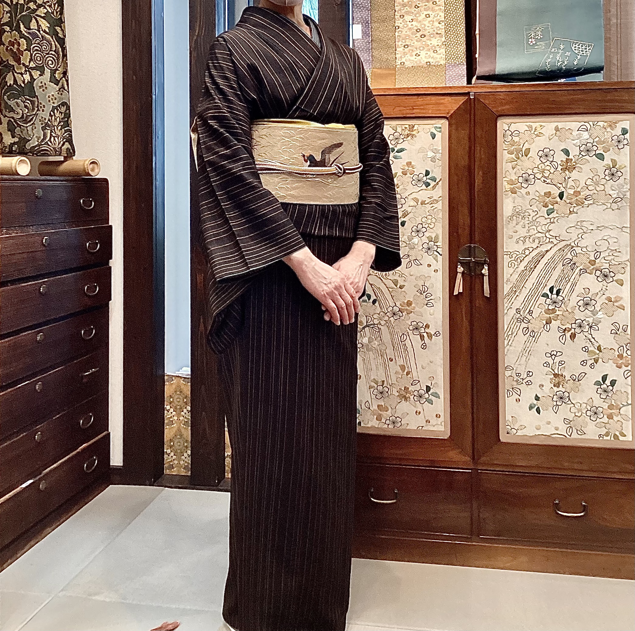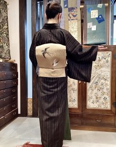 縞のお着物に、ツバメの刺繍帯でご来店いただきました。