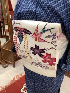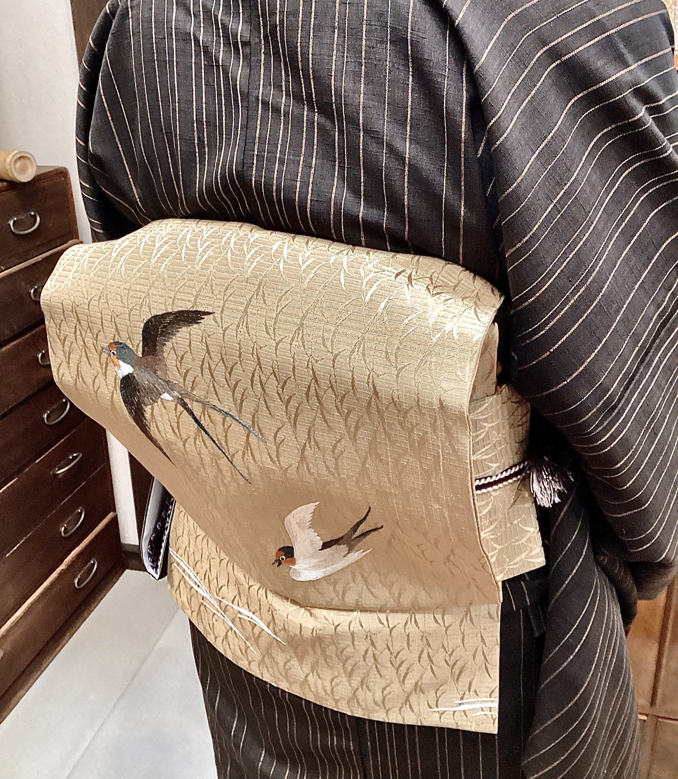 帯地に柳が織り出されて、柳に遊ぶツバメの図が風情があって素敵です。