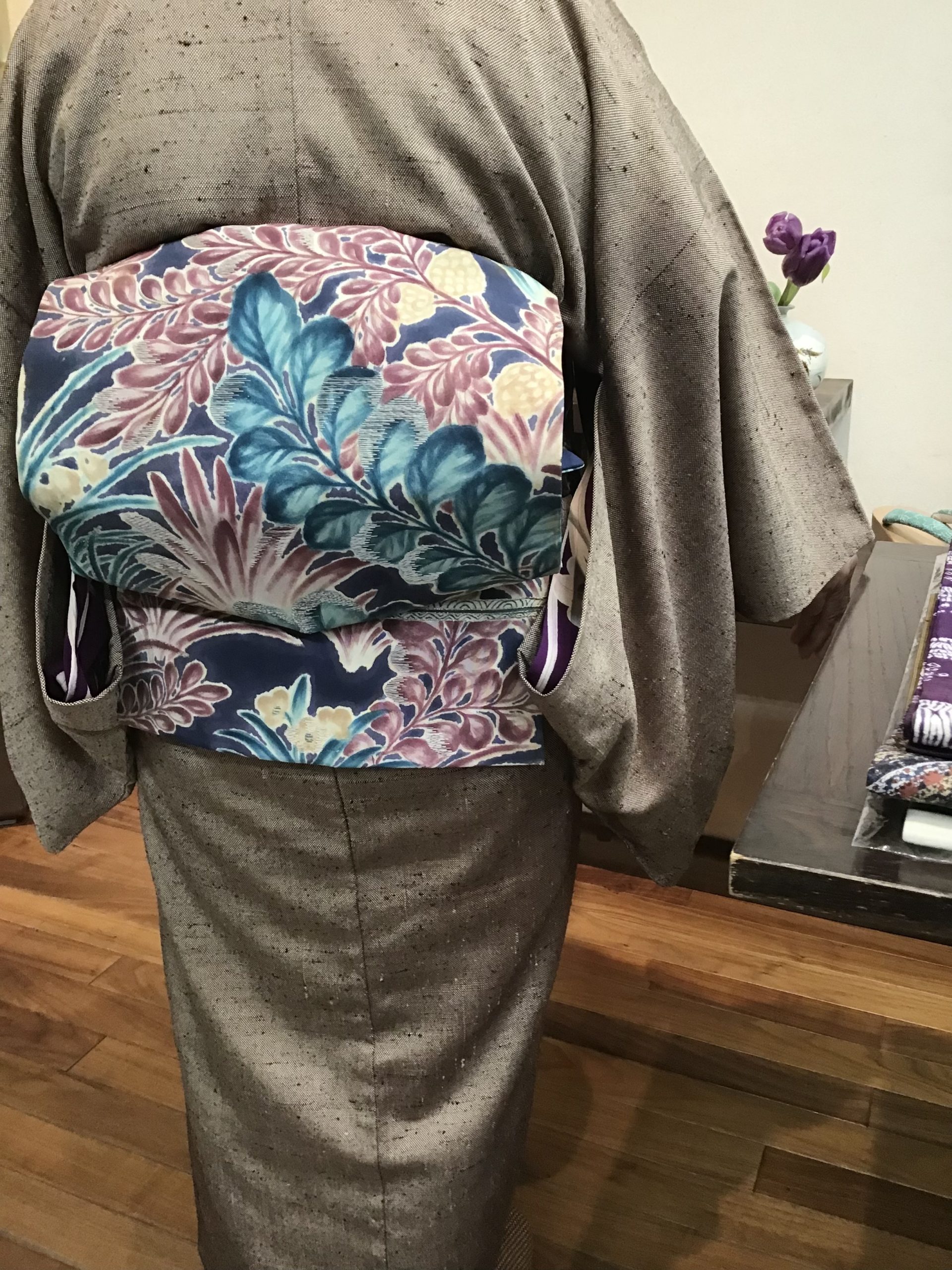 ゆったりと大胆な図柄に綺麗な配色、アンティークの染め帯ならではの魅力。